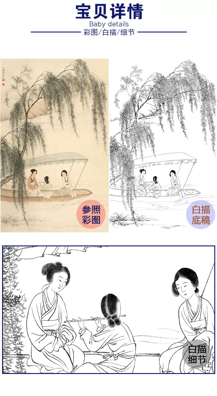 陈少梅竖幅山水工笔传统仕女人物白描底稿-《柳荫泛舟图》-多种白描尺寸可选-CR08