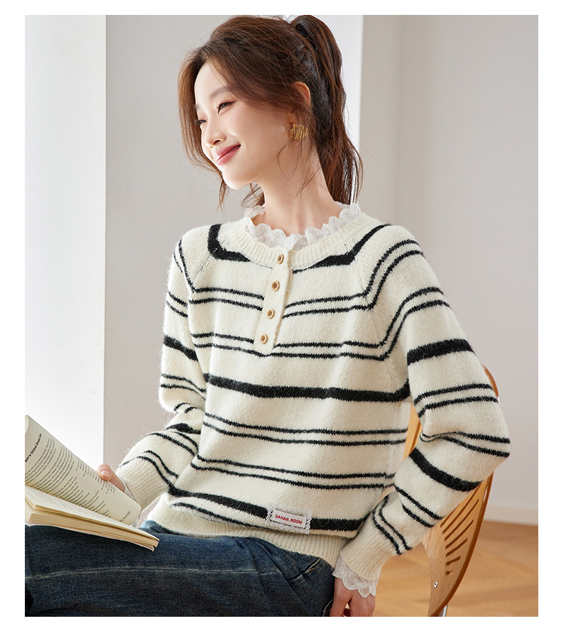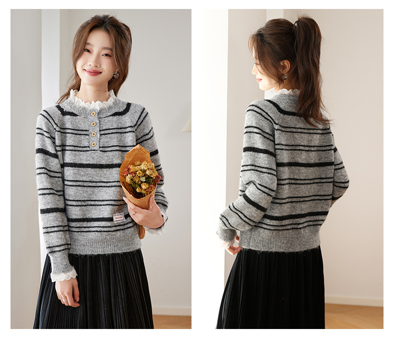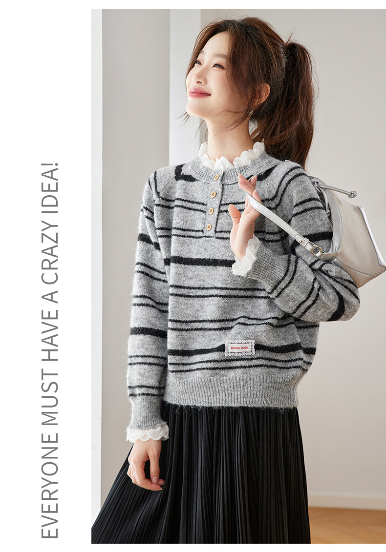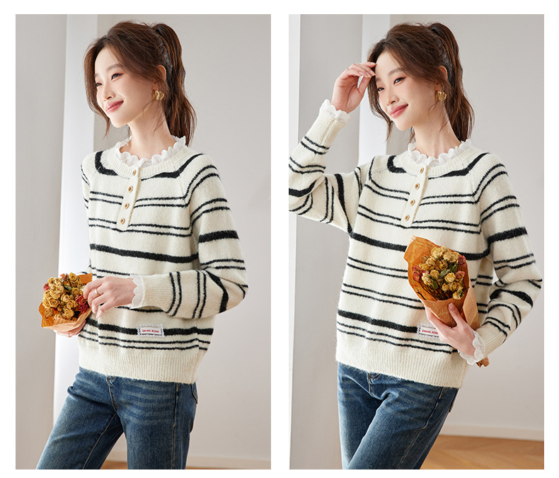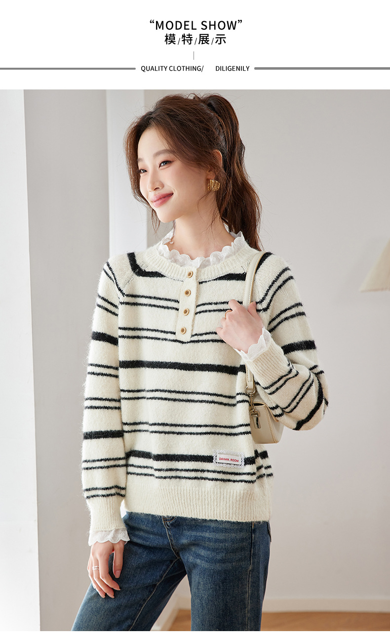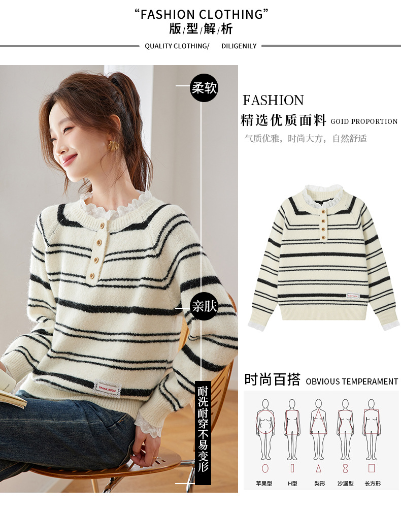 CC慵懒风蕾丝边圆领条纹毛衣女秋冬软糯内搭宽松套头针织衫打底上衣