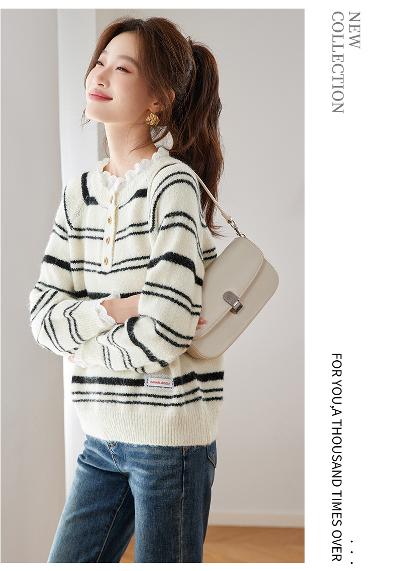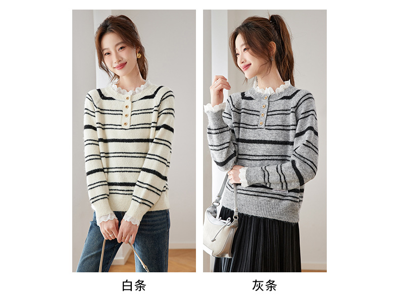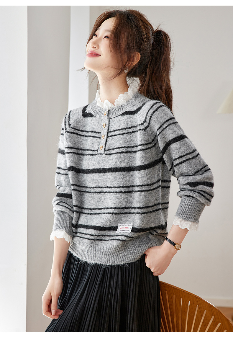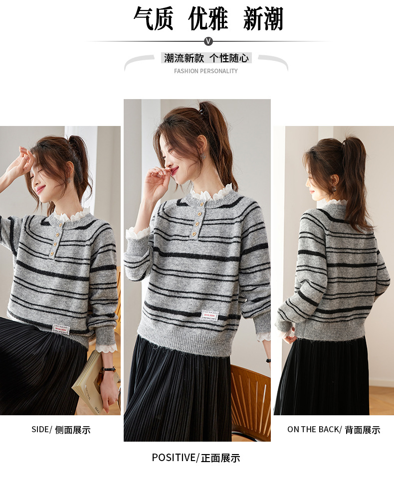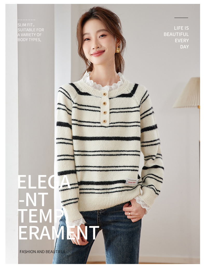 CC慵懒风蕾丝边圆领条纹毛衣女秋冬软糯内搭宽松套头针织衫打底上衣