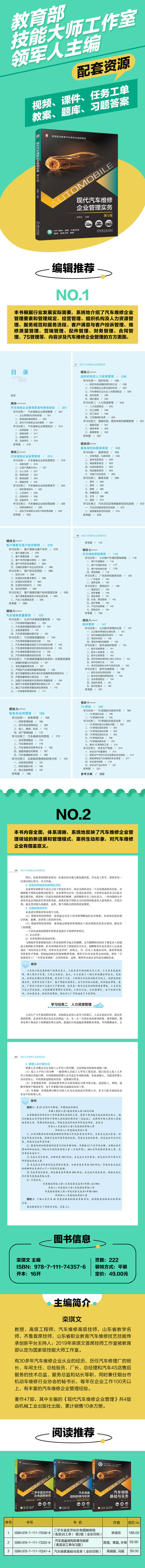 3)贯彻党的二十大报告提出的“法治社会是构筑法治国家的基础。弘扬社会主义法治精神,传承中华优秀传统法律文化,引导全体人民做社会主义法治的忠实崇尚者、自觉遵守者、坚定捍卫者”。努力使尊法学法守法用法在全社会蔚然成风。书中引用了新发布的国家法律法规。书中内容紧跟新发布的国家规定、条例和标准,其中包括《中华人民共和国安全生产法》(2021年9月1日施行)、《中华人民共和国道路运输条例》(2022年5月1日起施行)、《汽车维修业经营业务条件》(2024年4月1日实施)、《机动车维修管理规定》(2021年8月11日第四次修正)、《机动车维修服务规范》(2021年4月1日实施)、《道路运输车辆技术管理规定》(2023年6月1日施行)、《道路运输从业人员管理规定》(2022年11月10日施行)、《缺陷汽车产品召回管理条例实施办法》(根据2020年10月23日国家市场监督管理总局令第31号修订)、《家用汽车产品修理更换退货责任规定》(2022年 1 月 1 日施行)、《明码标价和禁止价格欺诈规定》(2022年7月1日施行)。本书的内容正是参考这些法律法规和标准编写的。