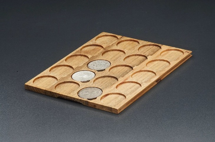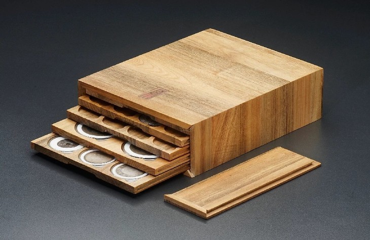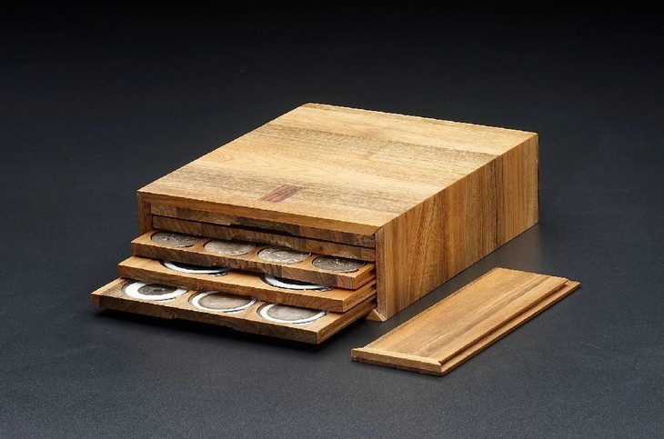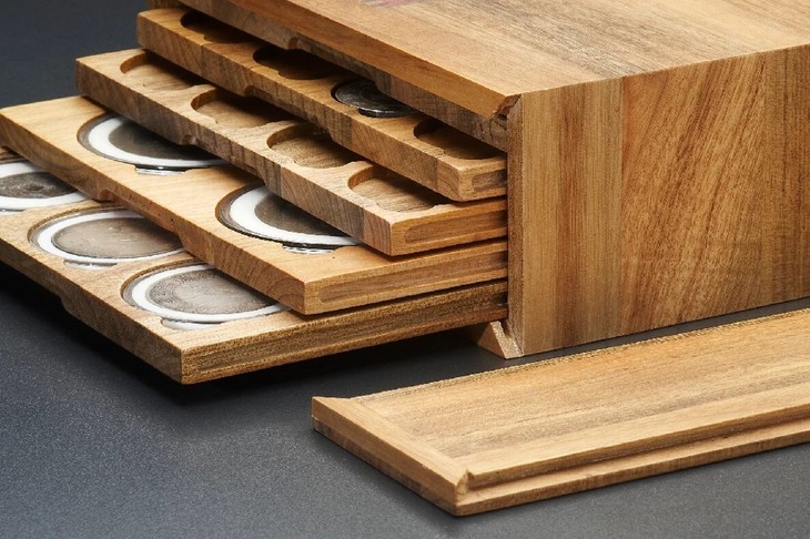 香樟木五层泉函(精品圆盒裸币钱币收藏盒)(5MH),香樟木五层泉函(精品圆盒裸币钱币收藏盒),内配五层木托,尺寸:207*253*90mm,采用小叶香樟精工细作(正面嵌入黑胡桃小标签),外盒暗藏自锁式传统榫卯工艺,木函体积小,容量大又不占空间,有三款内托可选,52圆盒一层12只装,71圆盒一层6只装,银元裸币一层20只装(银元养包浆神器),平放竖放均可,函内钱币不错槽,不伤币,外出携带方便,欣赏交流随心应手,是一款颠覆传统塑料币册的好产品!精工制作,工序繁杂,生产周期长,是款不错的收藏专用盒!