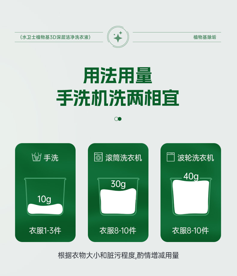 机洗:8-10件衣物约用一瓶盖(10ml),顽固污渍先预涂浸泡。手洗:温和不伤手,洗完手部不干涩。这款洗衣液逢人必安利!洁净力、温和度、安全性、性价比全都兼顾到了!有它守护,相当于给全家人的衣物穿上了一层“天然防护盾”🛡️!