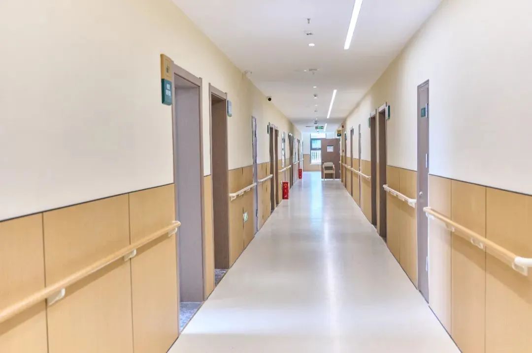 走进安养中心,修葺一新的院子里空间宽敞,绿植、水池等配套设施相得益彰。楼梯间、走廊上均做了适老处理