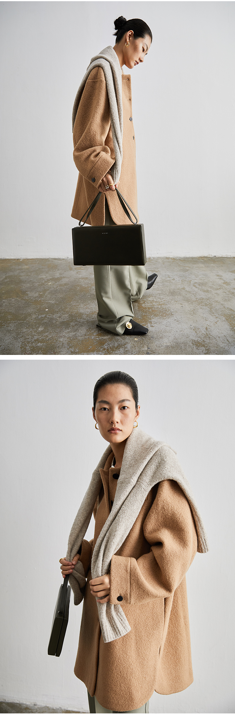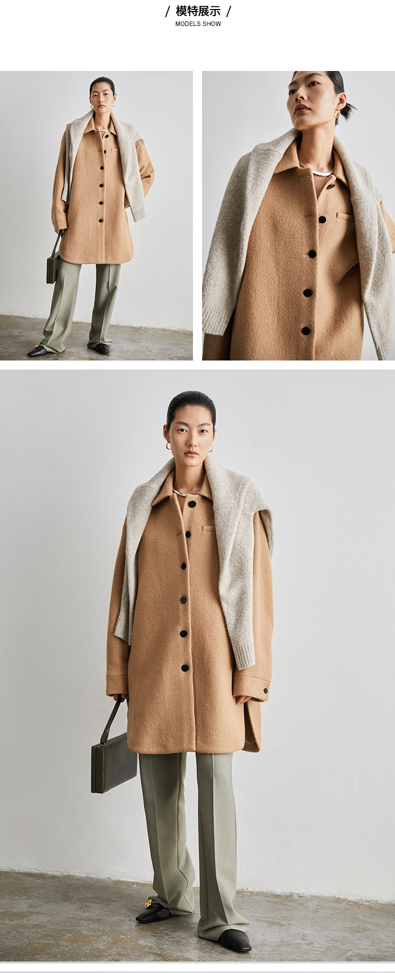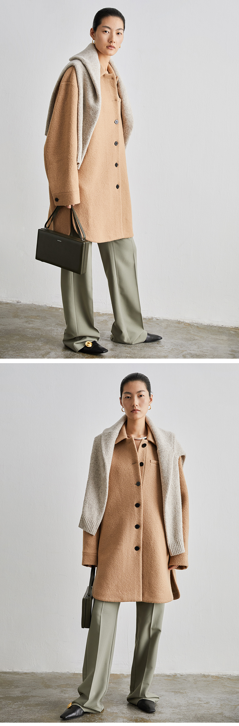 HIDEMI 简约设计感廓形纽扣小翻领厚羊毛大衣