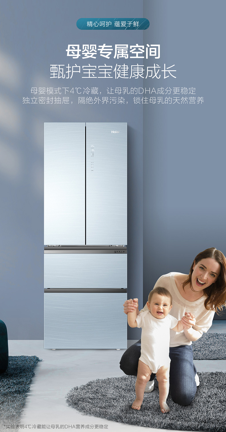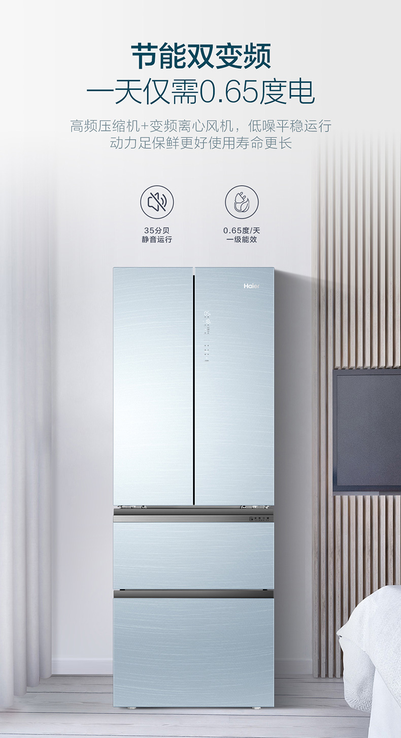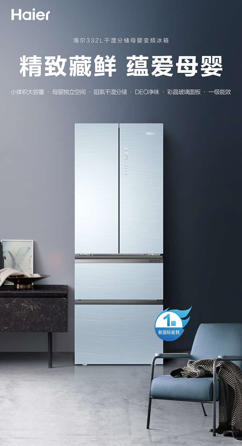 海尔(Haier)332升多门双变频冰箱 风冷无霜 阻氧干湿分储 专属母婴空间 钢化玻璃面板BCD-332WFCL