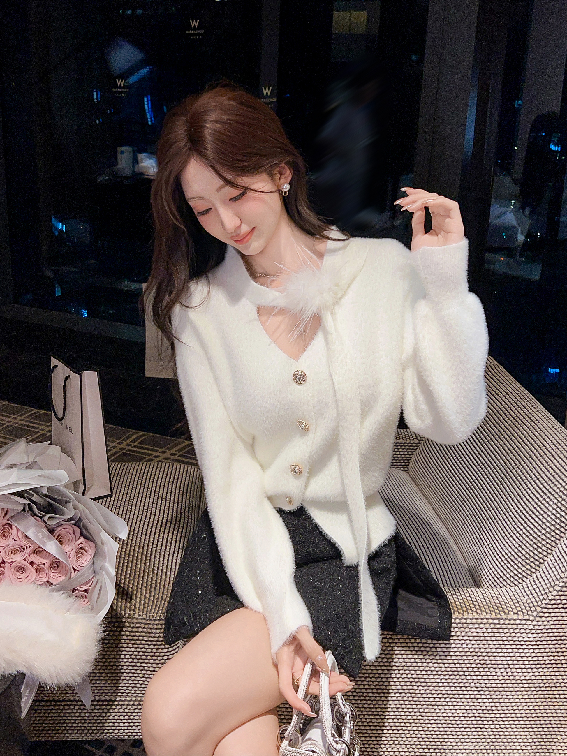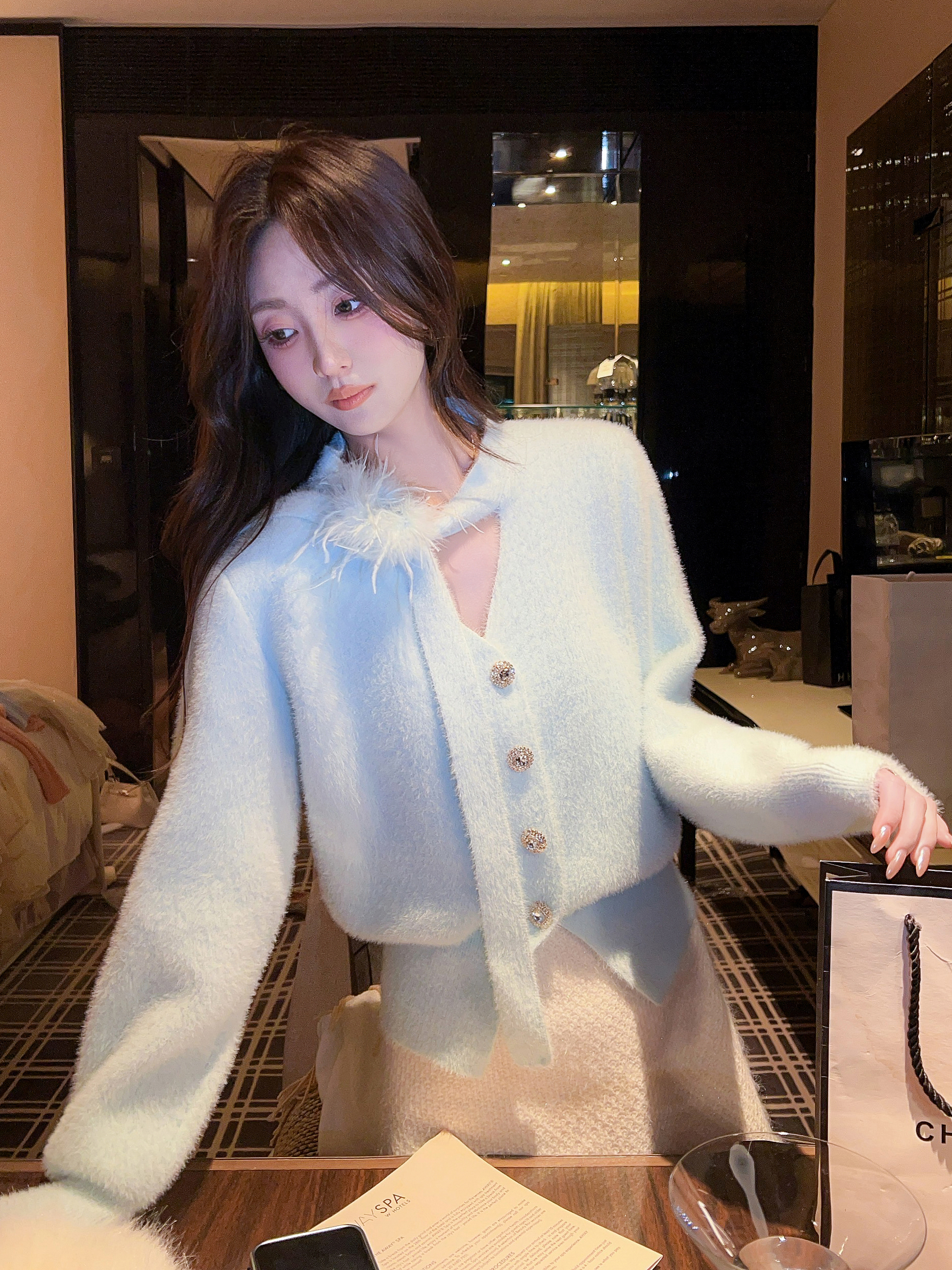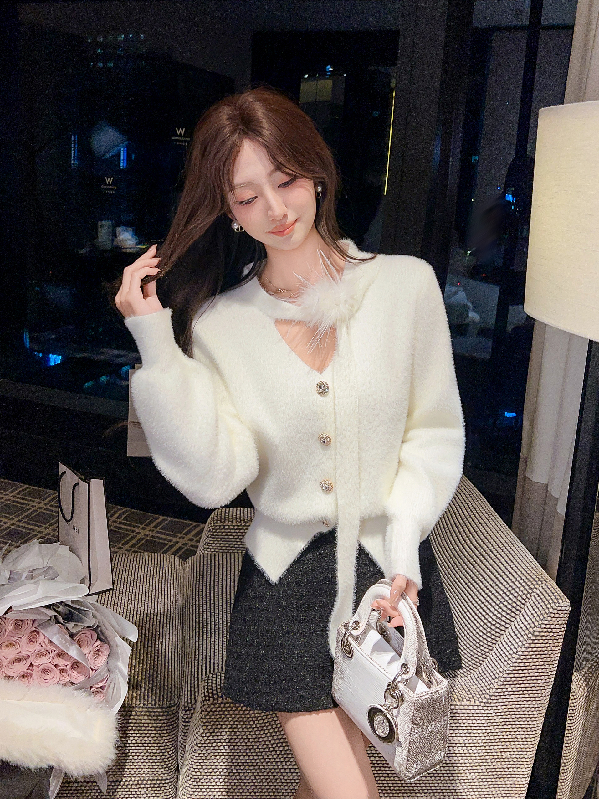 张心子【绒雪奶油】V领系带氛围感羽毛毛衣 U2512025
