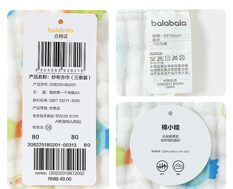 巴拉巴拉新生儿小方巾婴儿用品初生宝宝纯棉舒适简约清新三件装萌