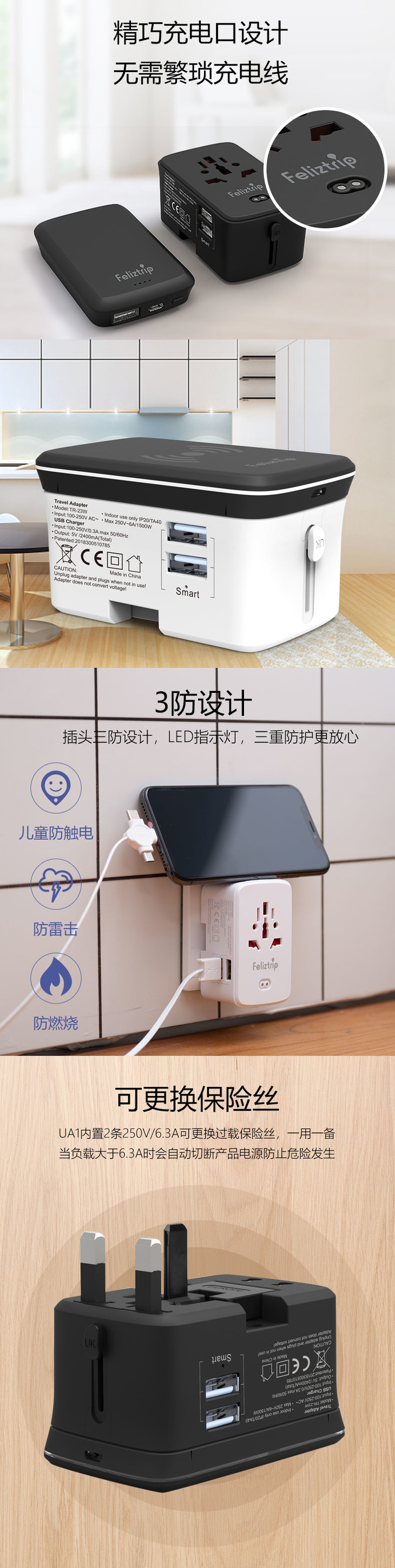 Feliztrip斐利斯 出国旅行多国通用带充电宝&无线充usb电源转换插座 TR-23B&23W