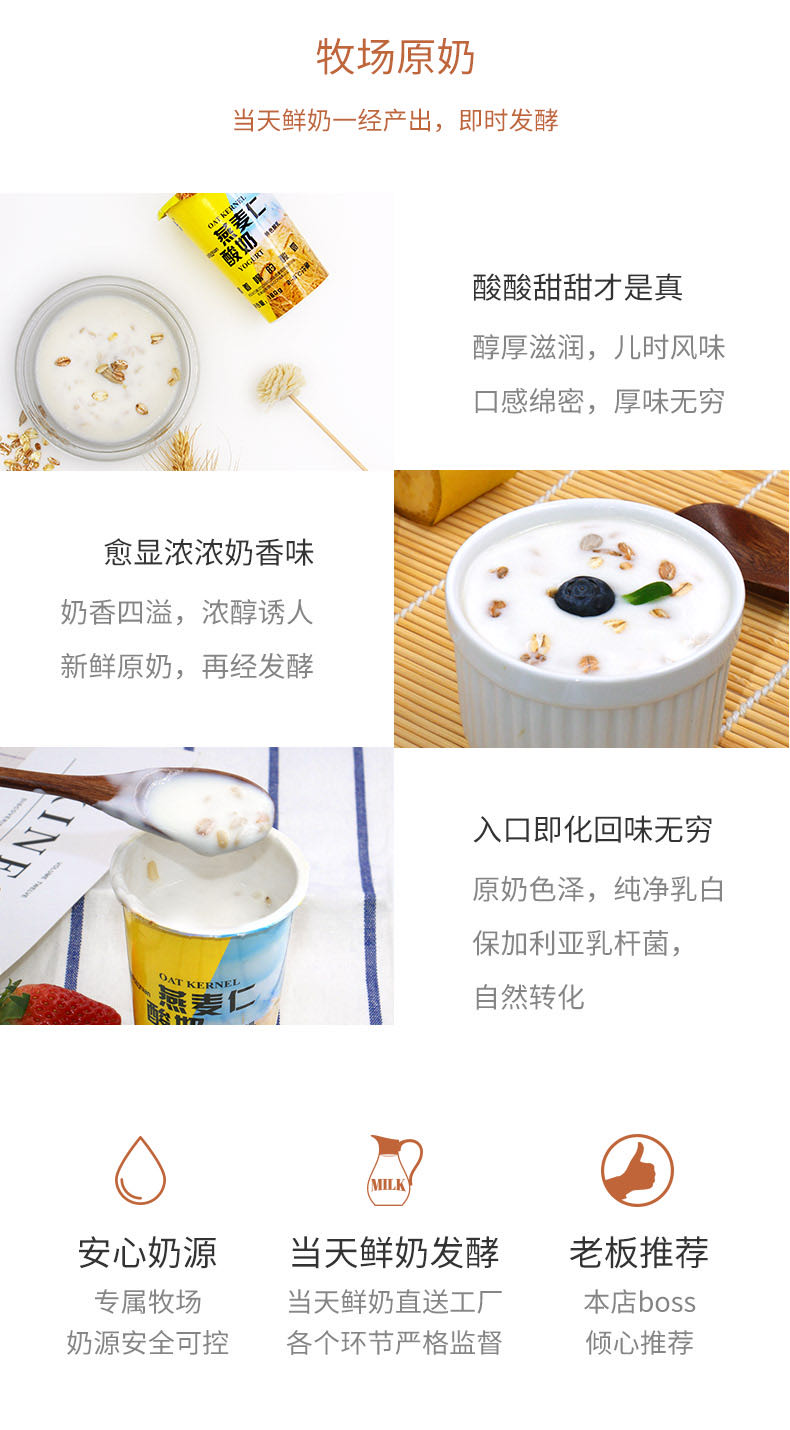 【产品特点】燕麦和酸奶的完美结合,健康营养无负担,一口全满足,专属牧场,安心奶源,当天鲜奶发酵,28天短保,全程冷链运送;