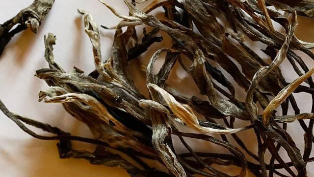 天门山的干茶条索粗壮狭长极为显眼,有的条索能有手掌那么长,条索显得凌乱又狂野,与一般古树茶比起来真得很独特。条索主要以长而黝黑为主;