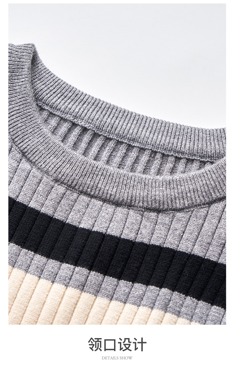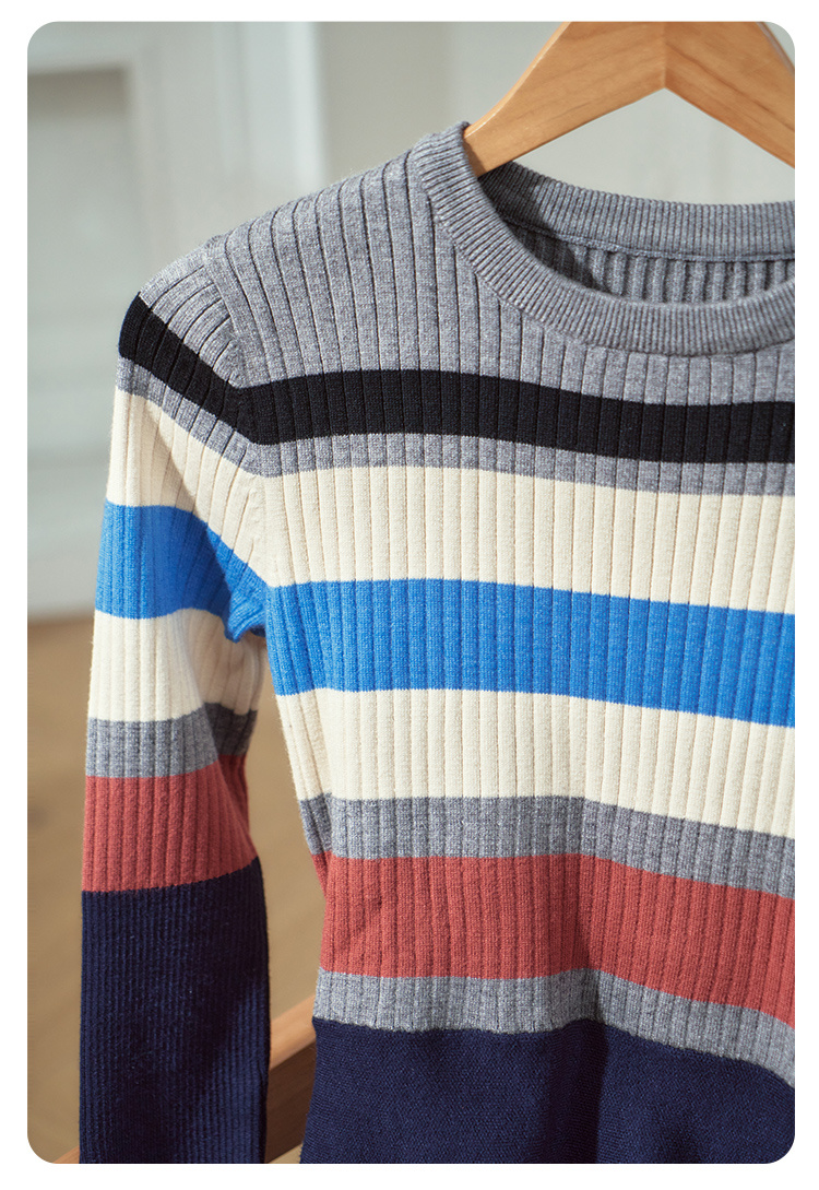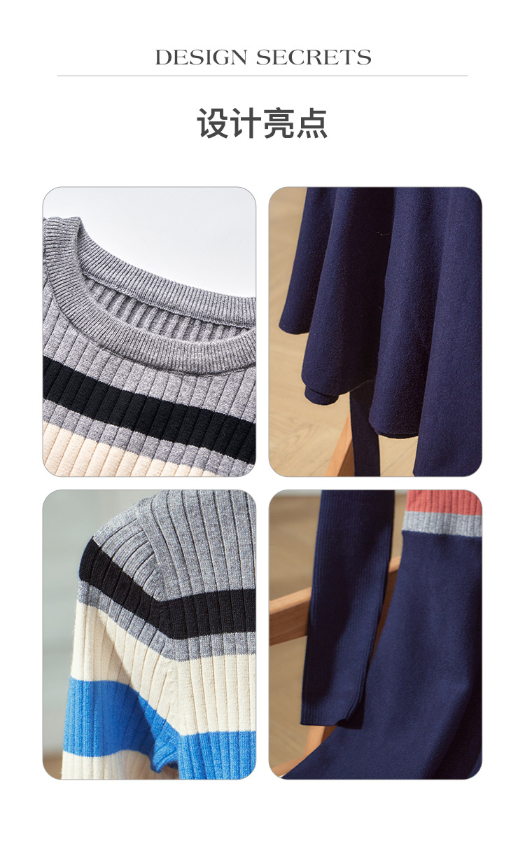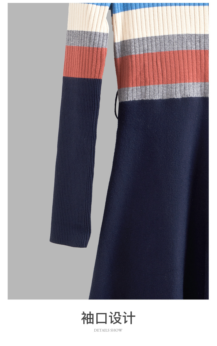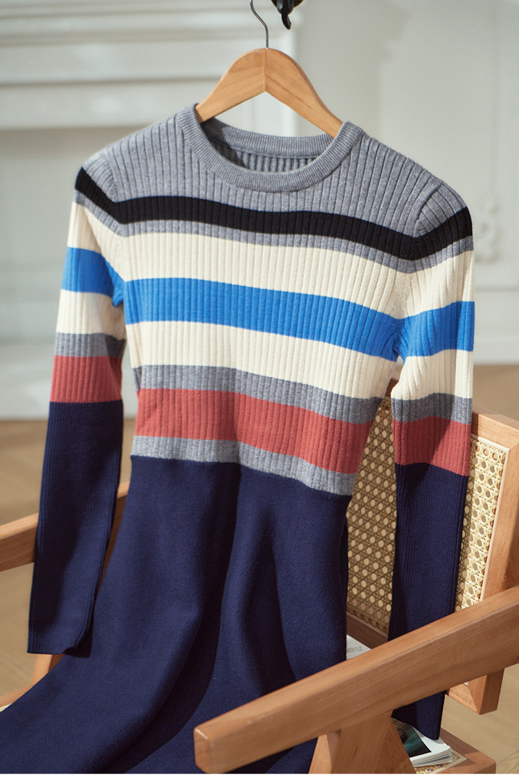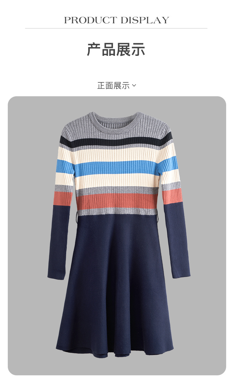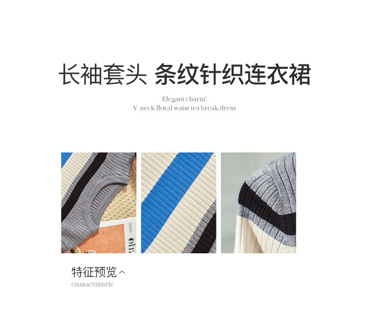 欧芮儿收腰显瘦长袖套头条纹弹力针织连衣裙女中长款