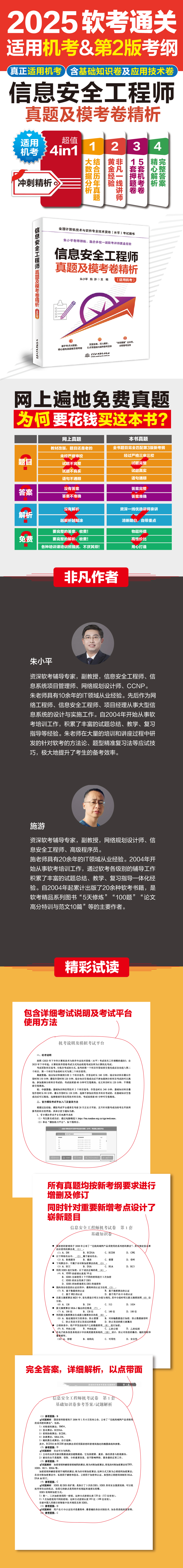 | 自信息安全工程师2020版考试大纲发行及2023年11月考试改为机考以来,考试内容变化较大,考试的重点内容主要集中在网络安全法律与标准、密码学基础、安全体系结构、认证、物理和环境安全、网络攻击原理、访问控制、常见网络安全设备、网络安全审计等方面。这就导致部分历年考试试题和练习题等,不再适合当前备考。 本书各试卷中的题目,基于机考真题,并由作者通过分析考试数据、新版大纲新增或改变的内容及作者自身丰富的授课经验编制而成。因此,本书全部题目适用于考生当前备考使用,考生不必担心机考形式所带来的变化。本书所有的题目均配有深入的解析及答案。本书解析部分力图通过分析考点把复习内容延伸到所涉及的知识面,同时力图以严谨而清晰的讲解让考生们真正理解知识点。希望本书能够极大地提高考生的备考效率。 本书由长期从事软考培训工作的朱小平、施游老师担任主编。本书可作为考生备考“信息安全工程师”考试的学习资料,也可供相关培训班使用。 | |||||||