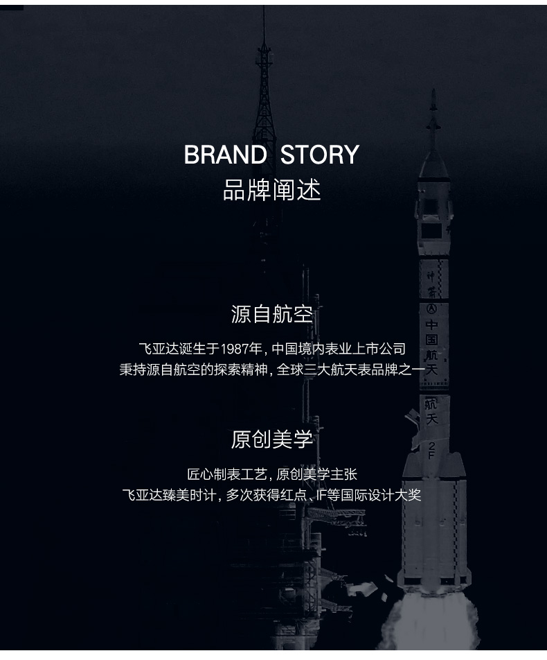 飞亚达表秉持源自航空的超精密工艺,飞亚达以专业与美感兼具的腕表设计,演绎对“飞”的艺术化探索,诠释非凡向上的品牌风范,讲述“一旦拥有,别无所求”的故事。