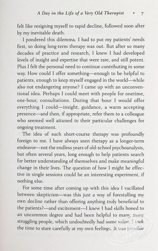 这是一部感人至深、发人深省的编年史,出自我们这个时代杰出的心理治疗师之一,讲述了他在全新环境下的工作,以及他在一次只接待一小时的患者时所面临的挑战和突破。