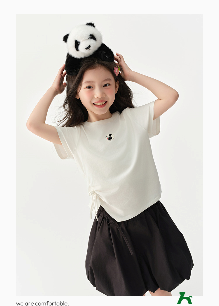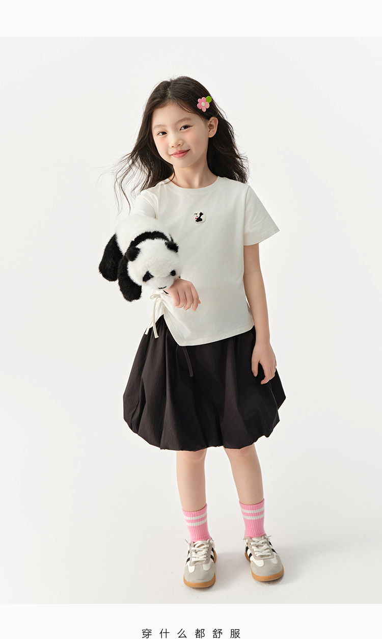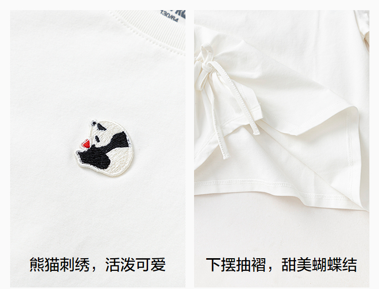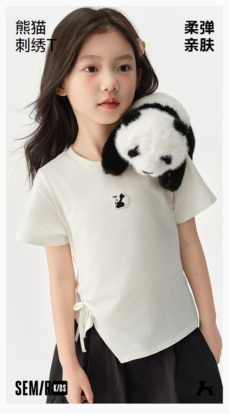 森马儿童短袖T恤2025夏新款女童可盐可甜熊猫刺绣上衣抽褶蝴蝶结
