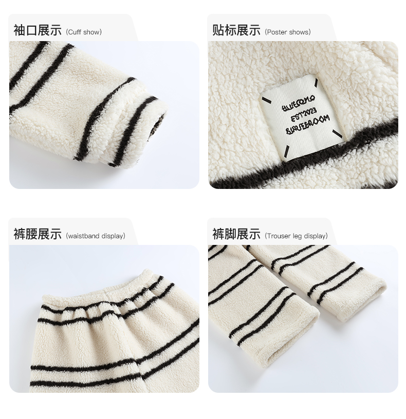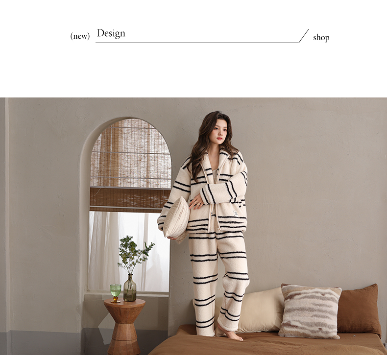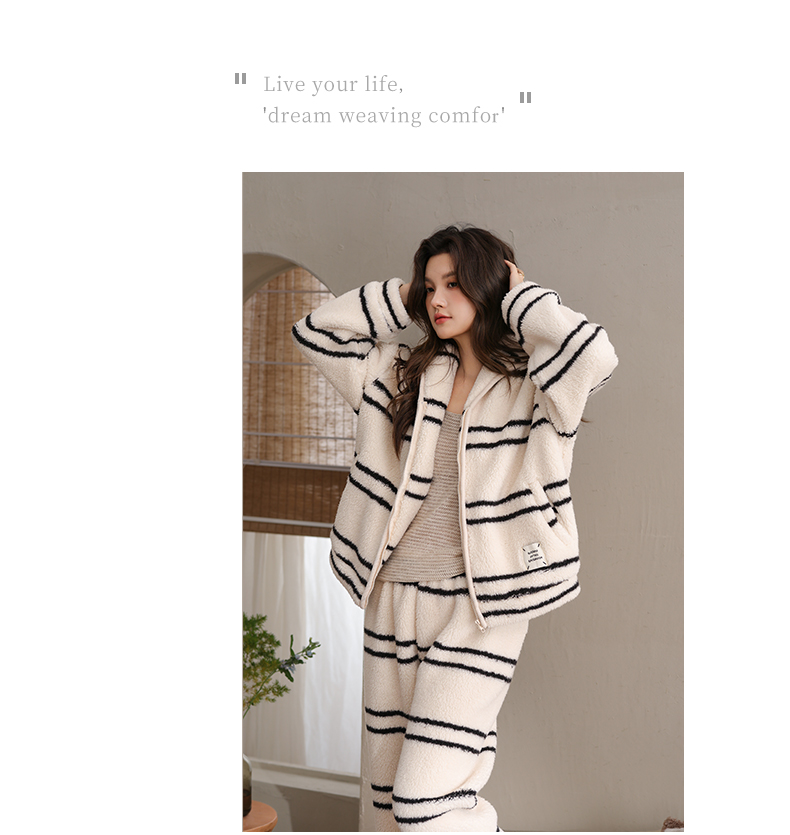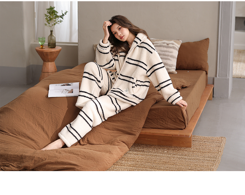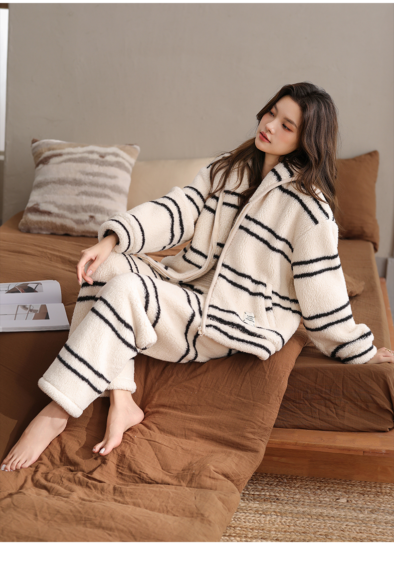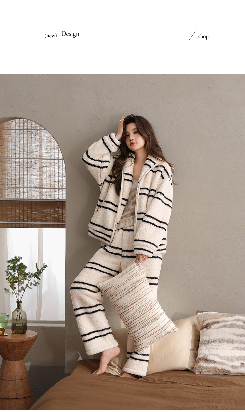 可人儿原创冬季舒棉绒韩系条纹女士睡衣保暖可外穿珊瑚绒家居服