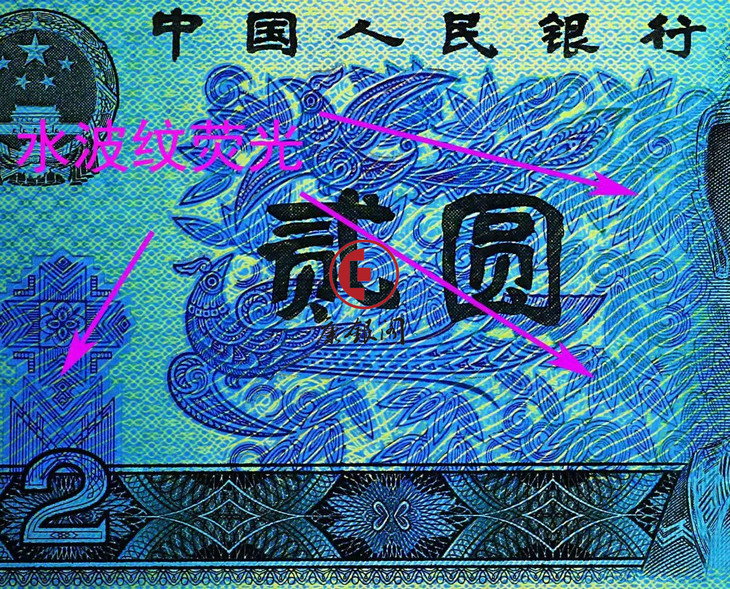 “绿翡翠”就是央行在90版2元身上试验下的荧光品种,其特点为:
