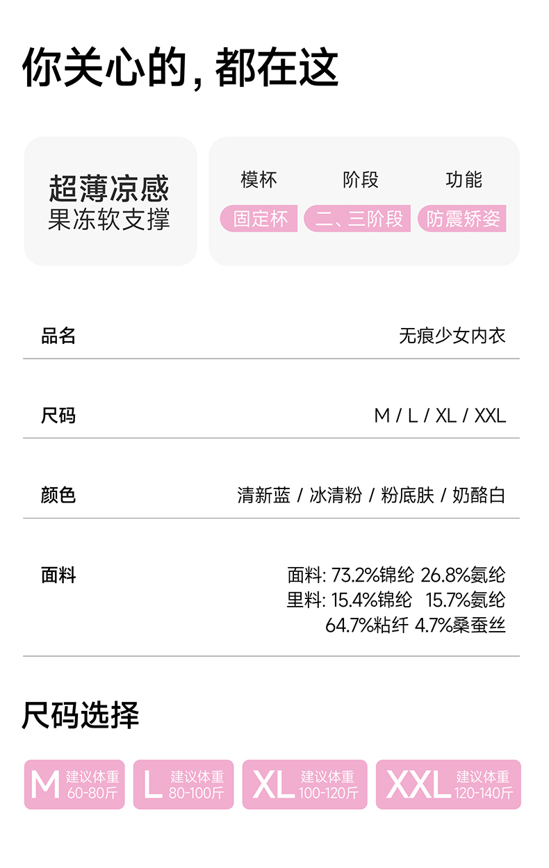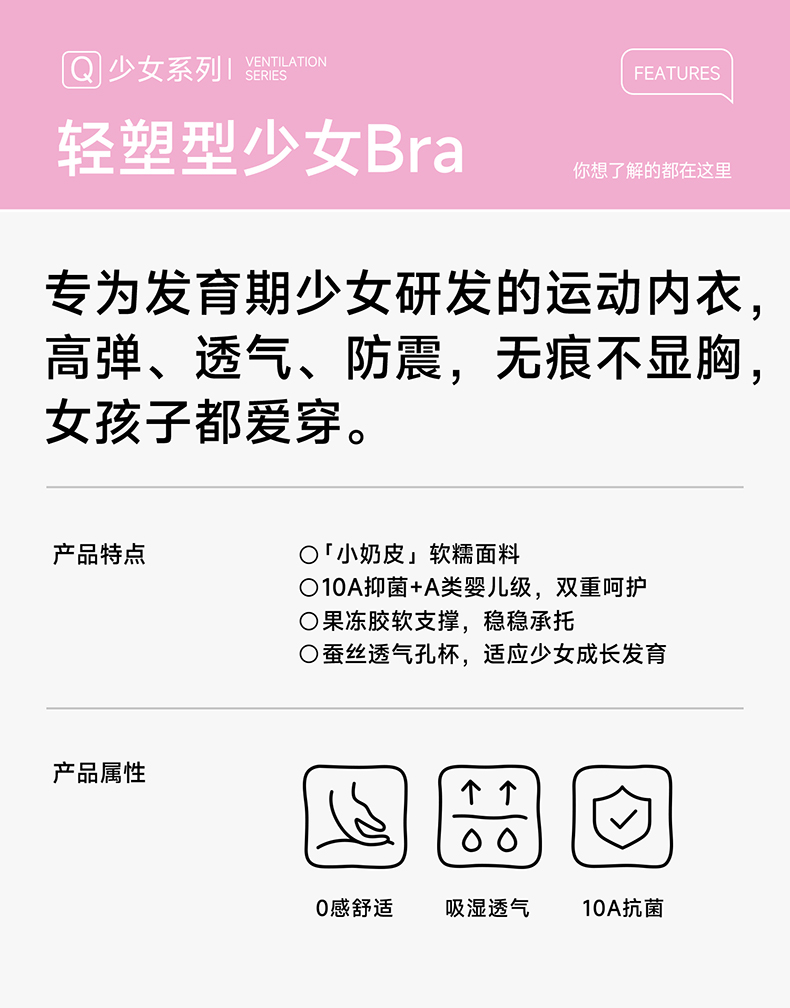 1.专为发育期少女体态研发,提拉定型,改善体态,隐形不显胸,校服白T好伴侣