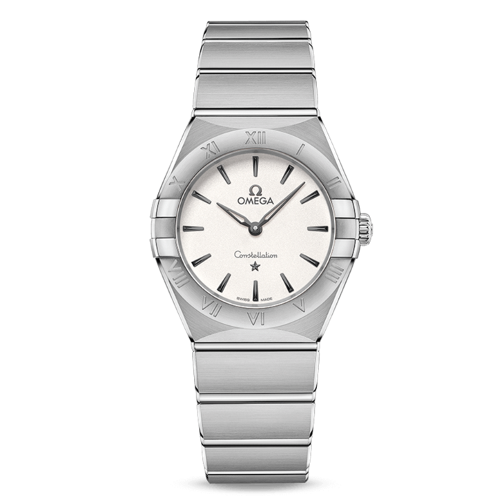 镜面材质 | 蓝宝石水晶玻璃 | 表盘 | 经典的半月形切面、“托爪”以及mono-rang表链。 精钢腕表,表圈镌刻罗马数字刻度,冰霜银表盘晶莹洁白,覆以耐磨损蓝宝石玻璃表镜。经过黑化处理的指针、欧米茄品牌标识、星座徽标以及小时刻度与白色表盘形成优雅对比。 密底,表背印有星座天文台徽章。 |