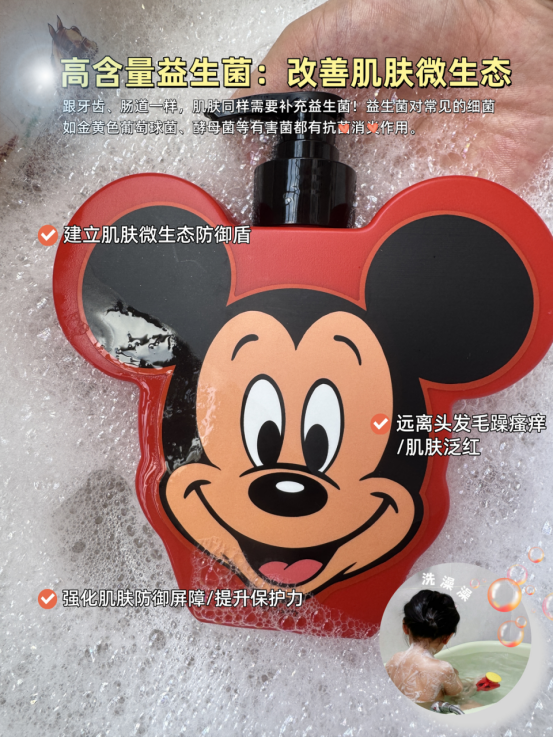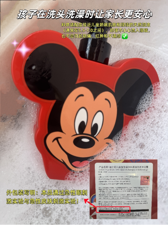 通过对洗发沐浴露的颜色性状、pH值、气味、总有效物、耐热、耐寒、菌落总数、霉菌和酵母菌总数、耐热大肠菌群、铜绿假单胞菌、金黄色葡萄球菌进行为期28天的数据测试,结果显示:该产品的感官指标、理化指标和卫生指标均符合标准,在有效期内产品质量稳定,为出现任何变质问题。 **迪士尼联名价值点**: • 洗澡护肤时间=童话剧场时间