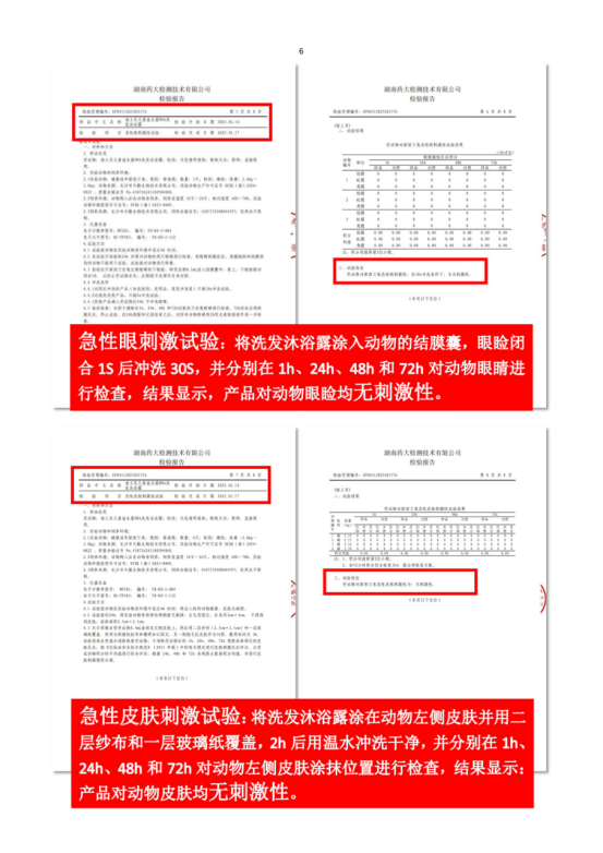 **急性眼刺激试验** 将洗发沐浴露涂入动物的结膜囊,眼睑闭合1S后冲洗30S,并分别在1h、24h、48h和72h对动物眼睛进行检查,结果显示,产品对动物眼睑均无刺激性。 **急性皮肤刺激试验** 将洗发沐浴露涂在动物左侧皮肤并用二层纱布和一层玻璃纸覆盖,2h后用温水冲洗干净,并分别在1h、24h、48h和72h对动物左侧皮肤涂抹位置进行检查,结果显示:产品对动物皮肤均无刺激性。