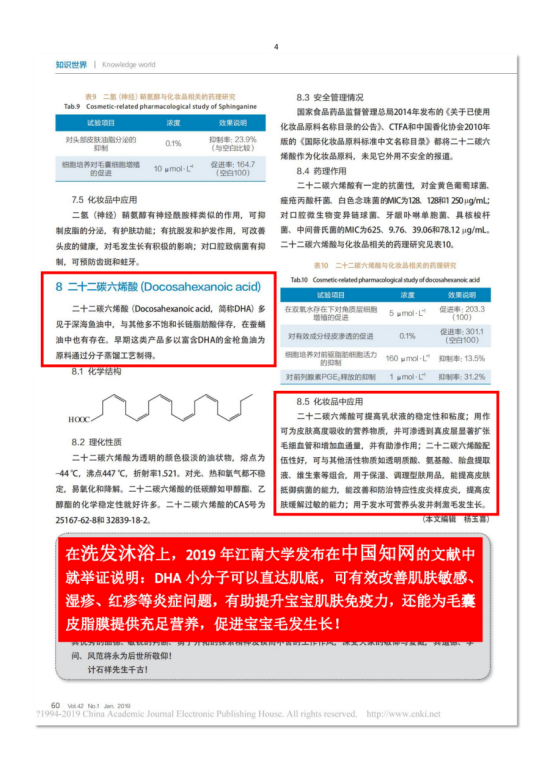 在洗发沐浴上,2019年江南大学发布在中国知网的文献中就举证说明:DHA小分子可以直达肌底,可有效改善肌肤敏感、湿疹、红疹等炎症问题, 有助提升宝宝肌肤免疫力,还能为毛囊皮脂膜提供充足营养,促进宝宝毛发生长!