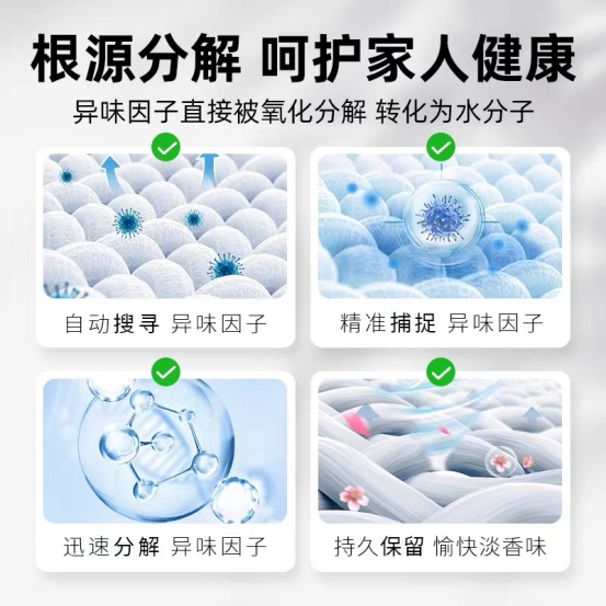 香气体验:自然不呛鼻,仿佛置身雨后花园! 喷出来的瞬间,不是那种廉价刺鼻的香精味 而是非常柔和、清新的自然香气,像刚下过雨的草地混合着淡淡海风,闻着超治愈! 留香也持久,早上喷一次,晚上回家还能闻到若隐若现的清香~ 除味实力派,不止是“遮羞布”! 它可不是简单用香味盖住异味! 核心成分是天然植物提取物,能真正分解臭味分子!