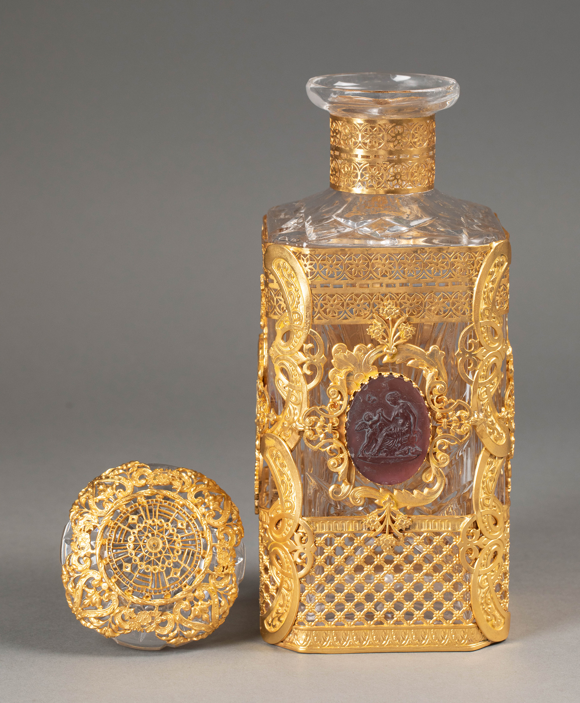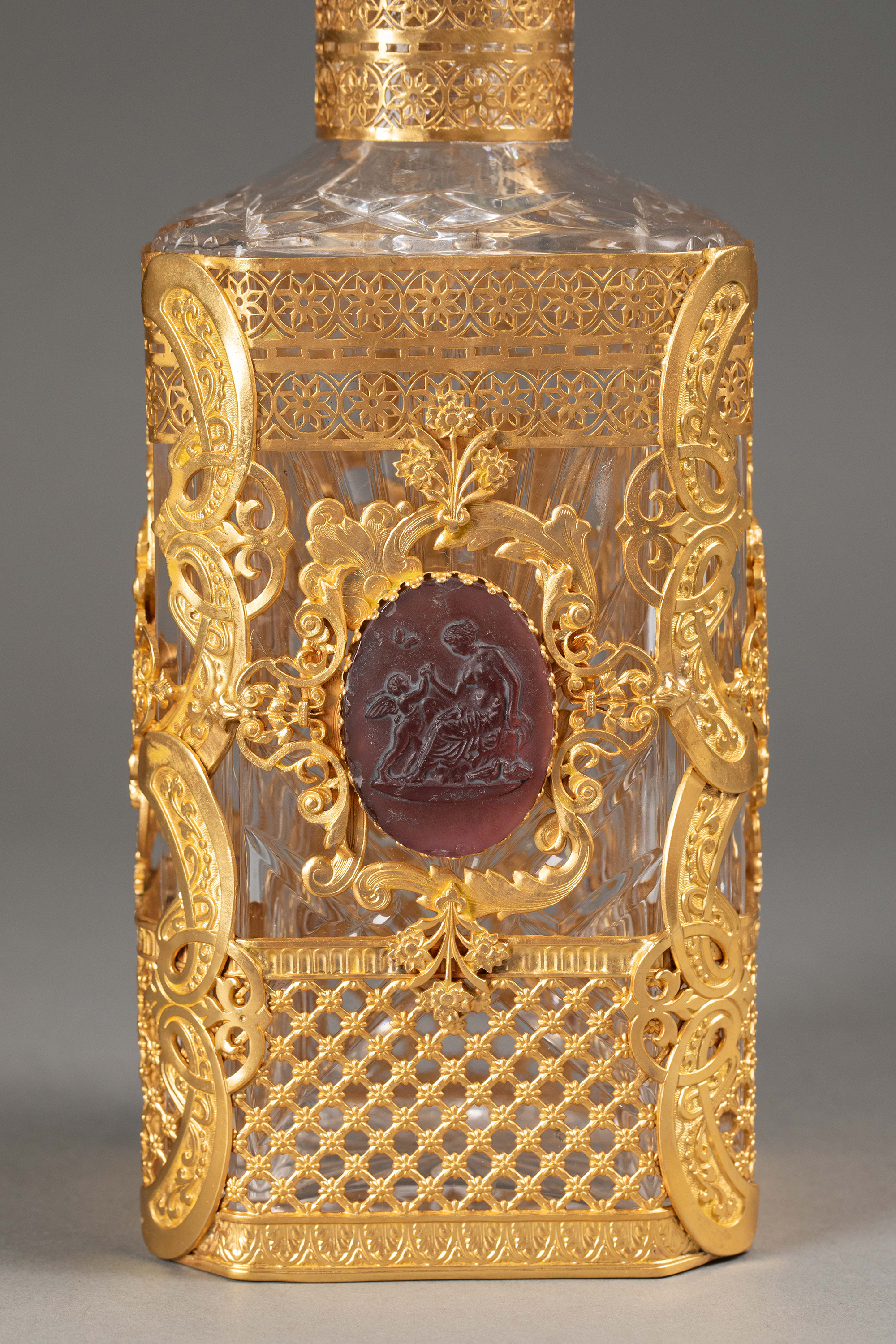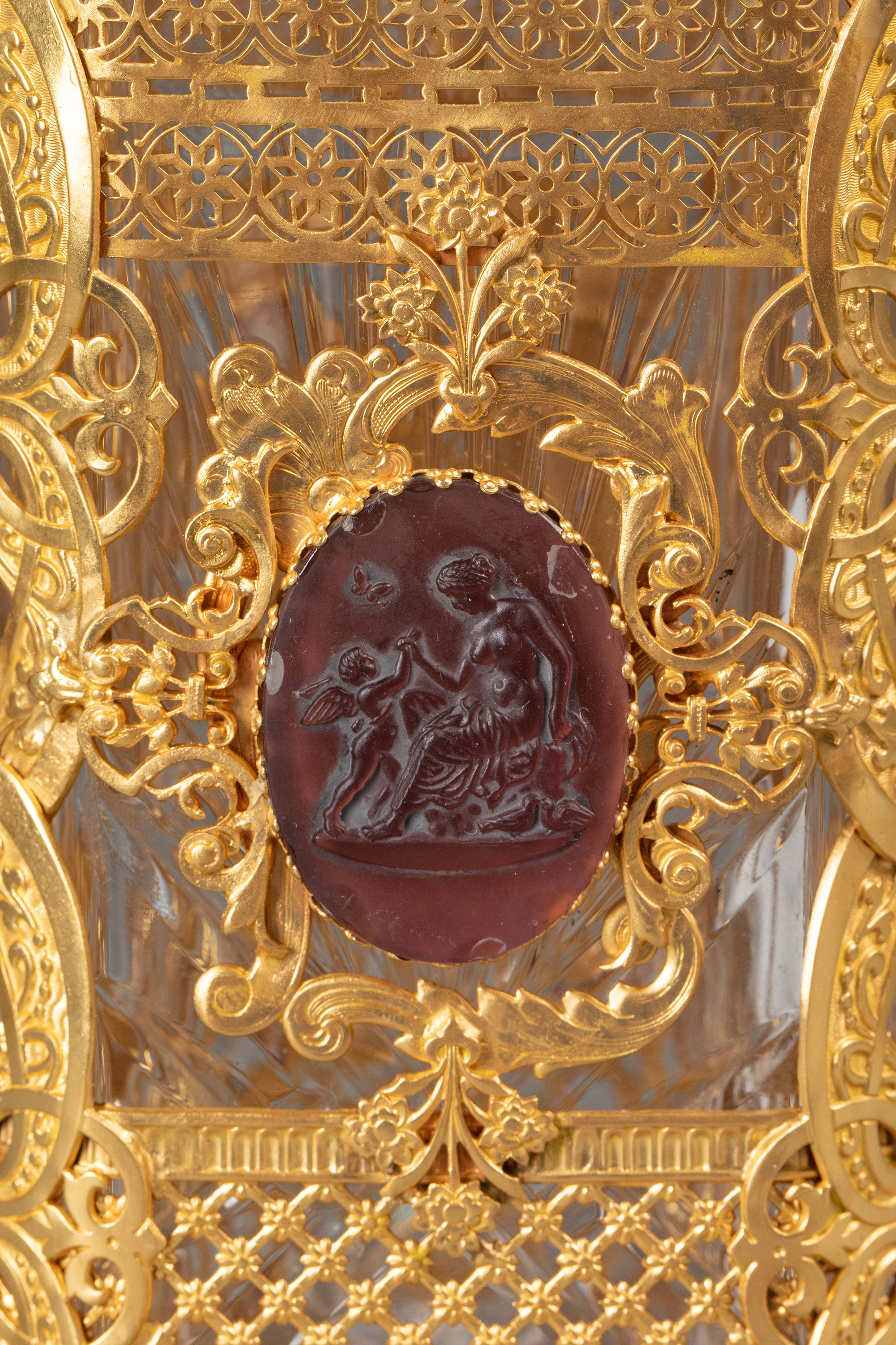 19世纪末法国出品古典卷叶纹铜鎏金精雕镶嵌女神与小天使主题卡梅奥装饰水晶烈酒瓶