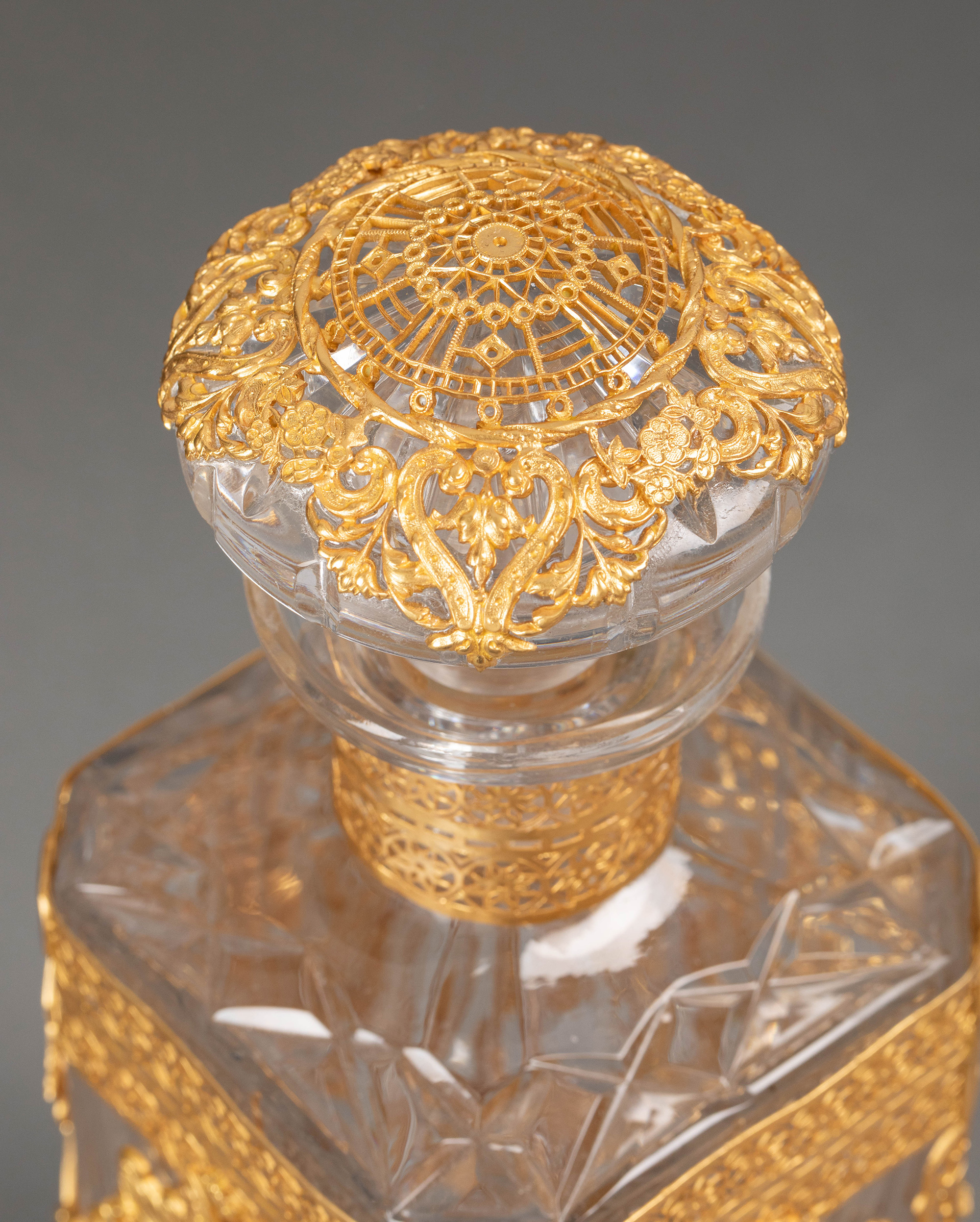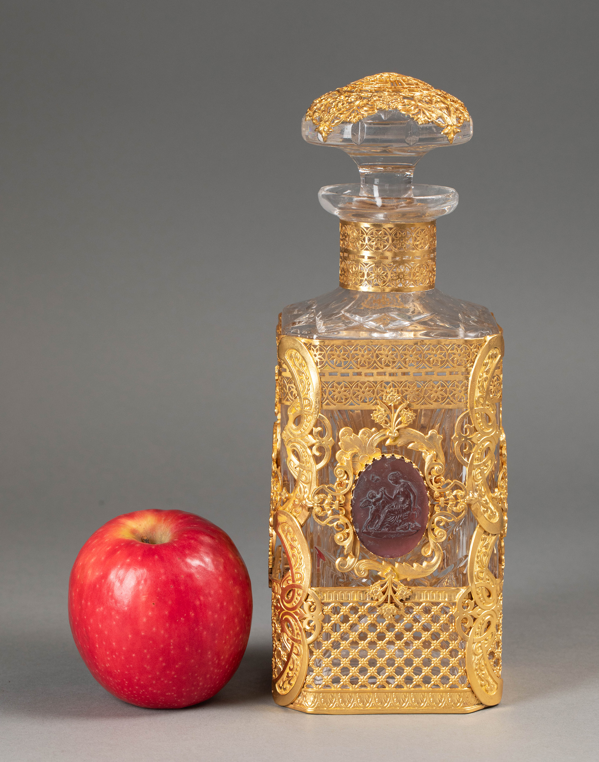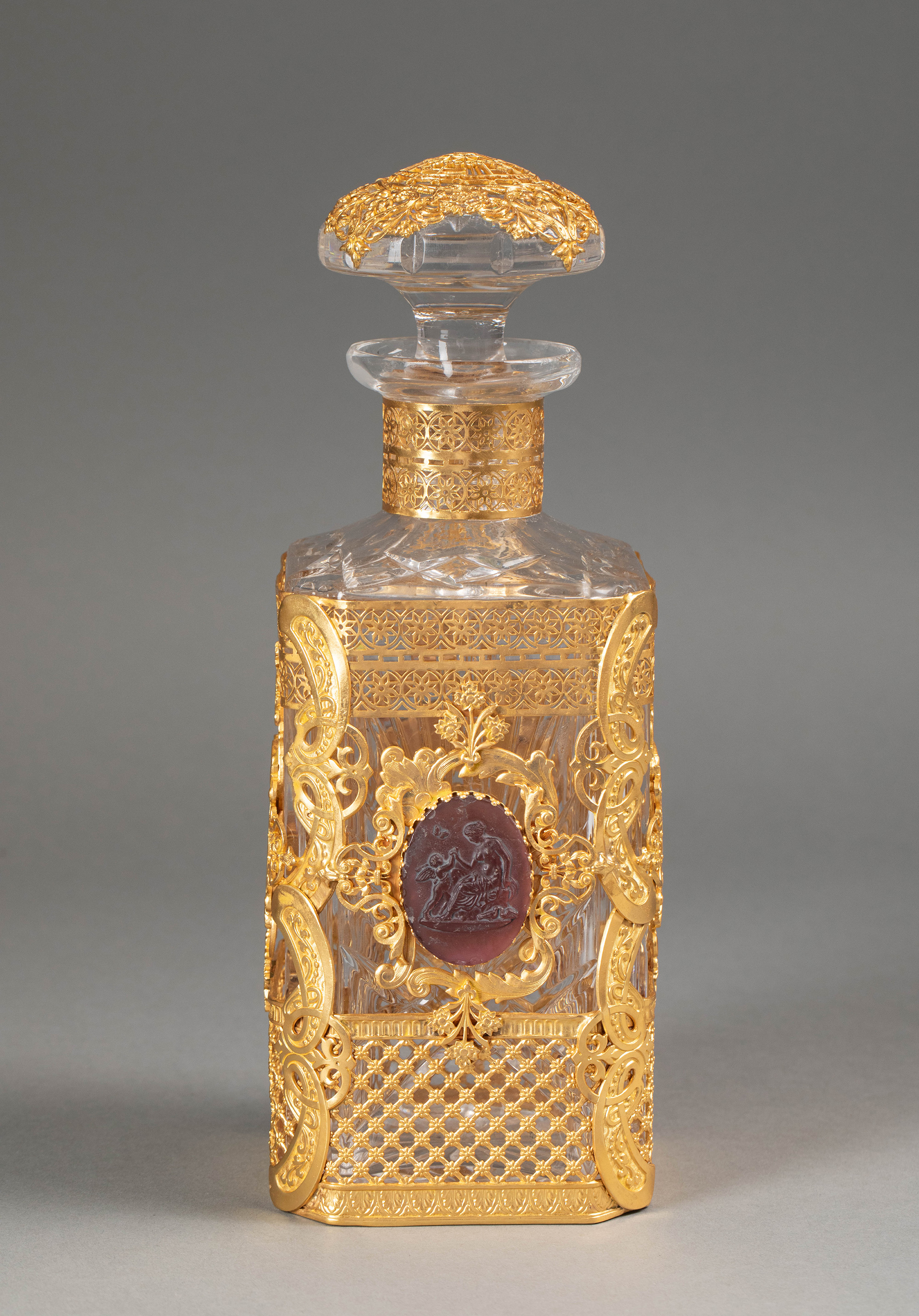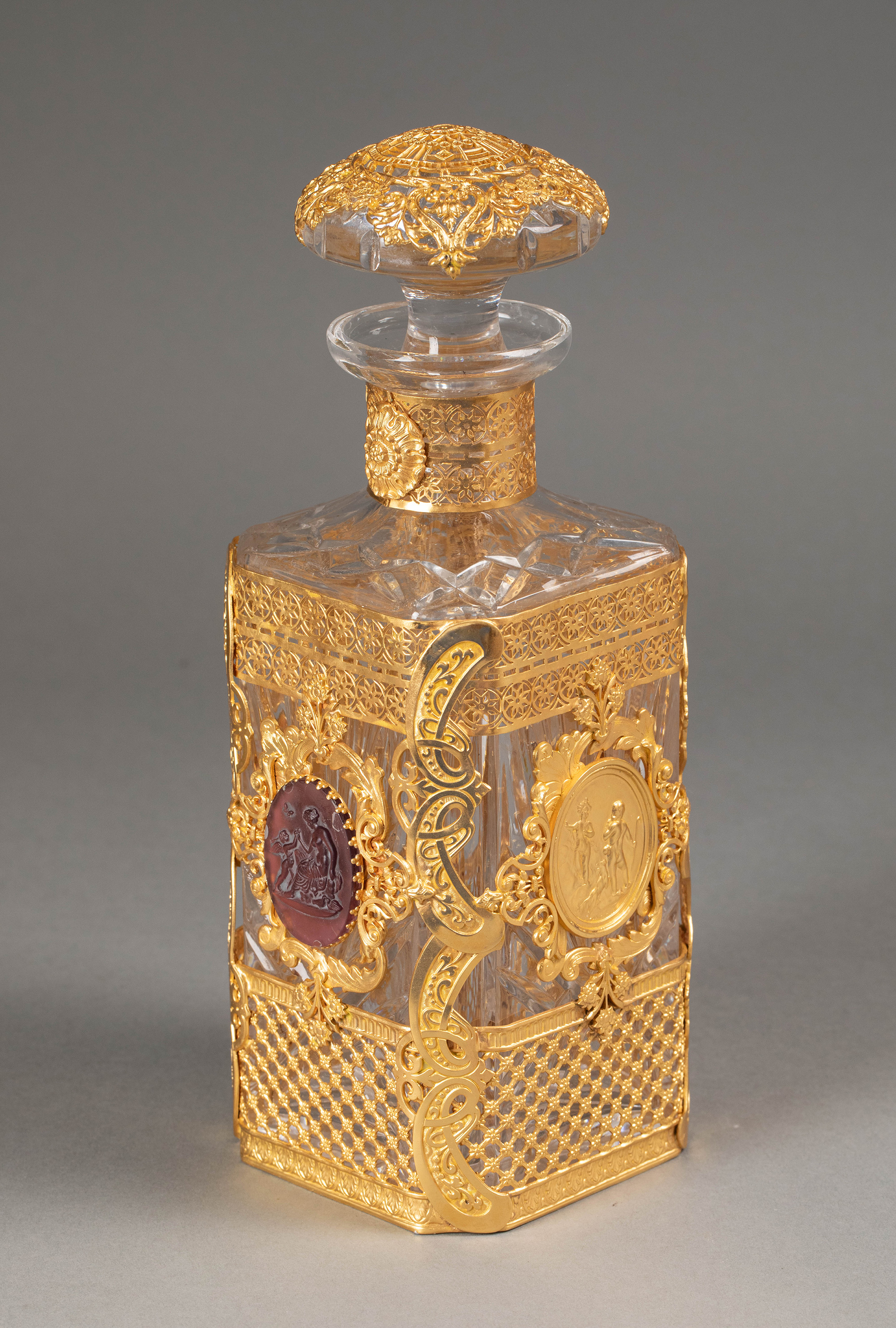 19世纪末法国出品古典卷叶纹铜鎏金精雕镶嵌女神与小天使主题卡梅奥装饰水晶烈酒瓶