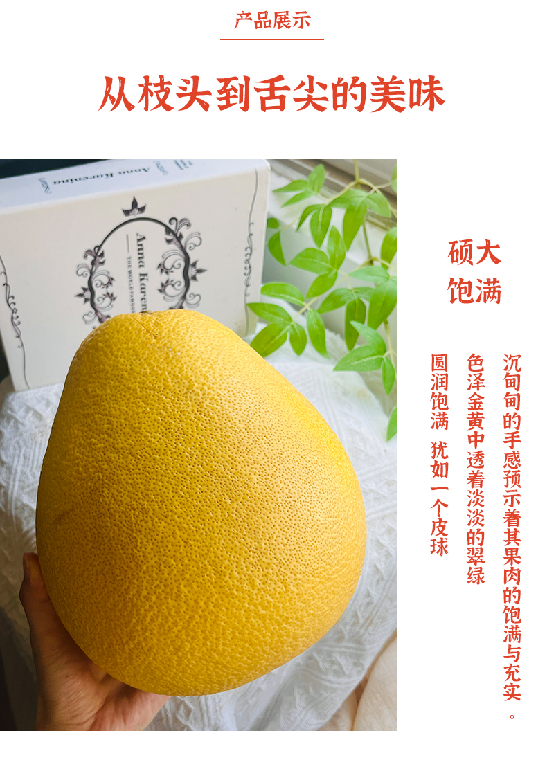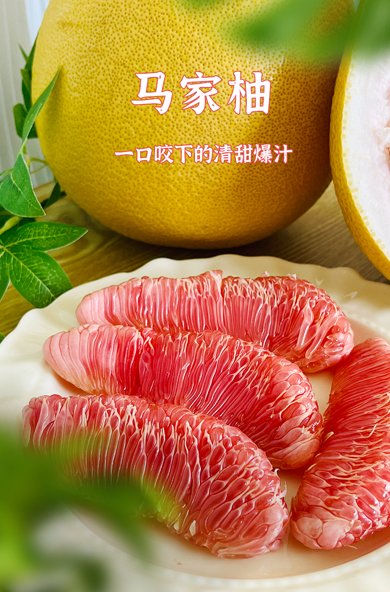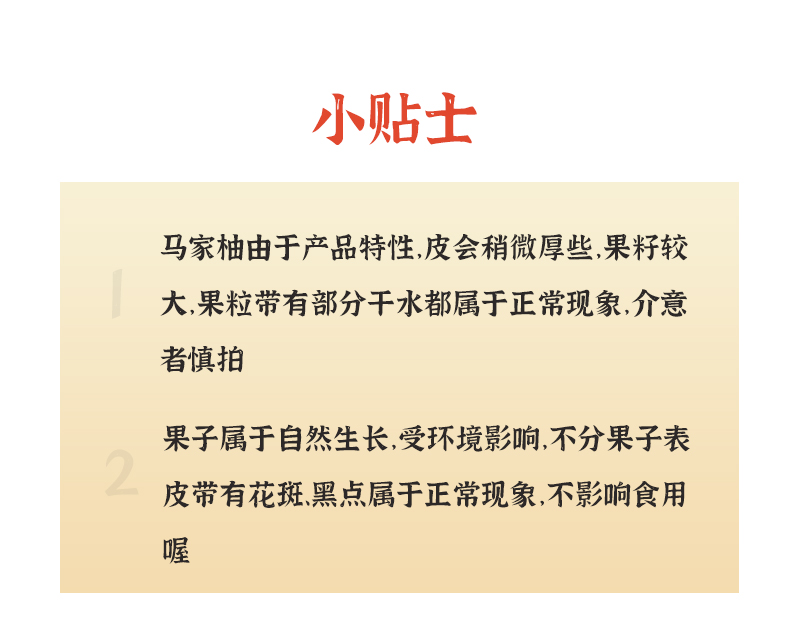 2.由于马家柚的产品特性,果籽较大、果皮较厚、果肉头尾带有部分干水属于正常现象,不影响食用~