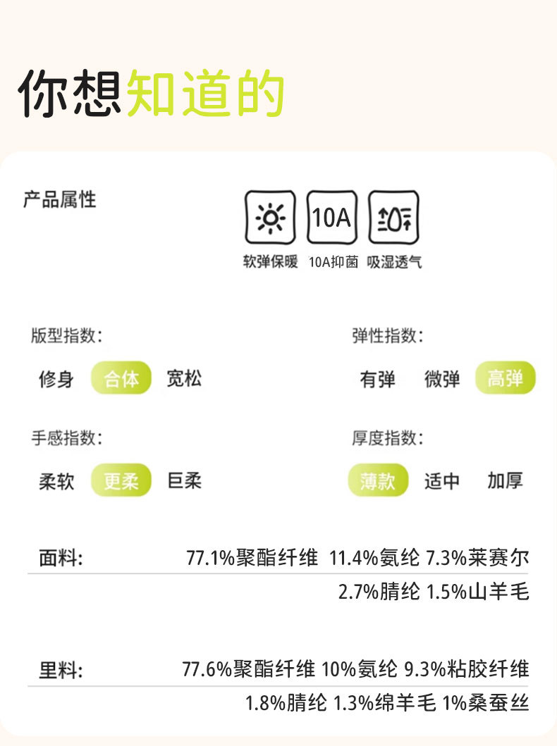 面料:77.1%聚酯纤维 11.4%氨纶 7.3%莱赛尔 2.7%腈纶 1.5%山羊毛
