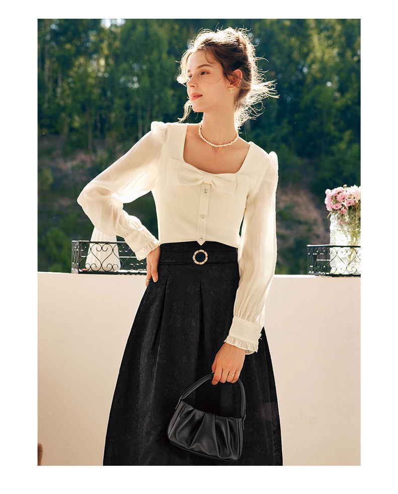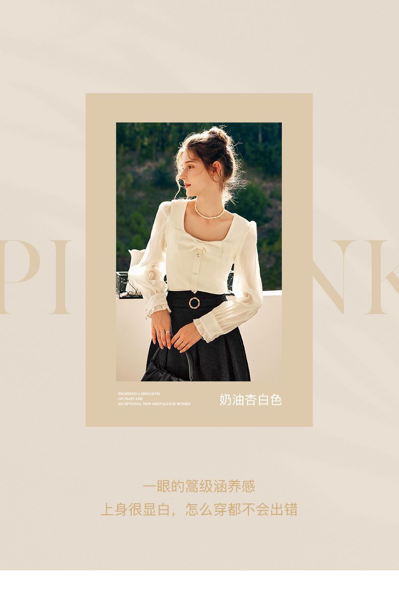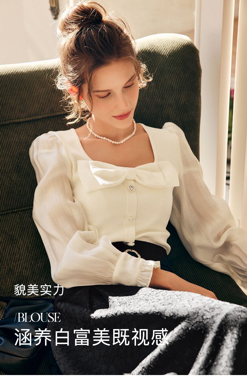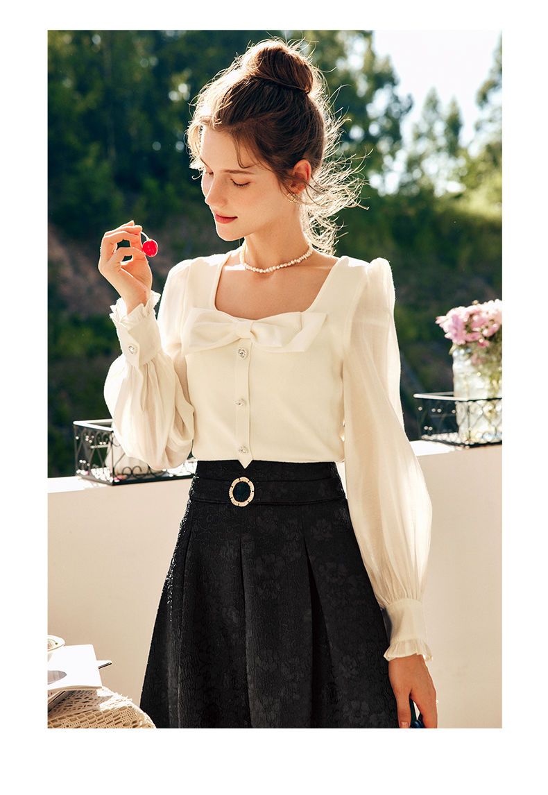 OLrain欧芮儿法式白色方领雪纺蕾丝衫女秋季2022年新款蝴蝶结小衫
