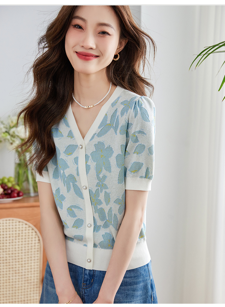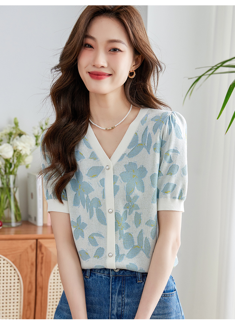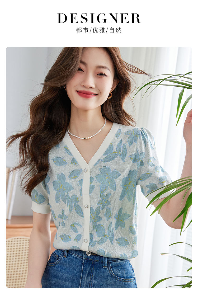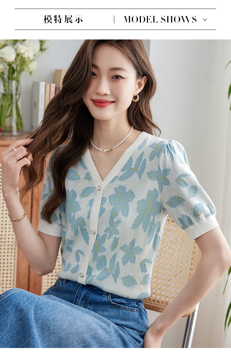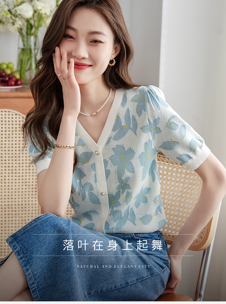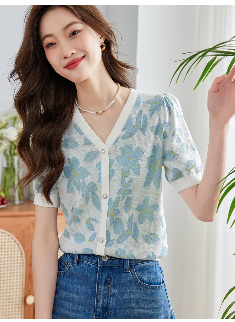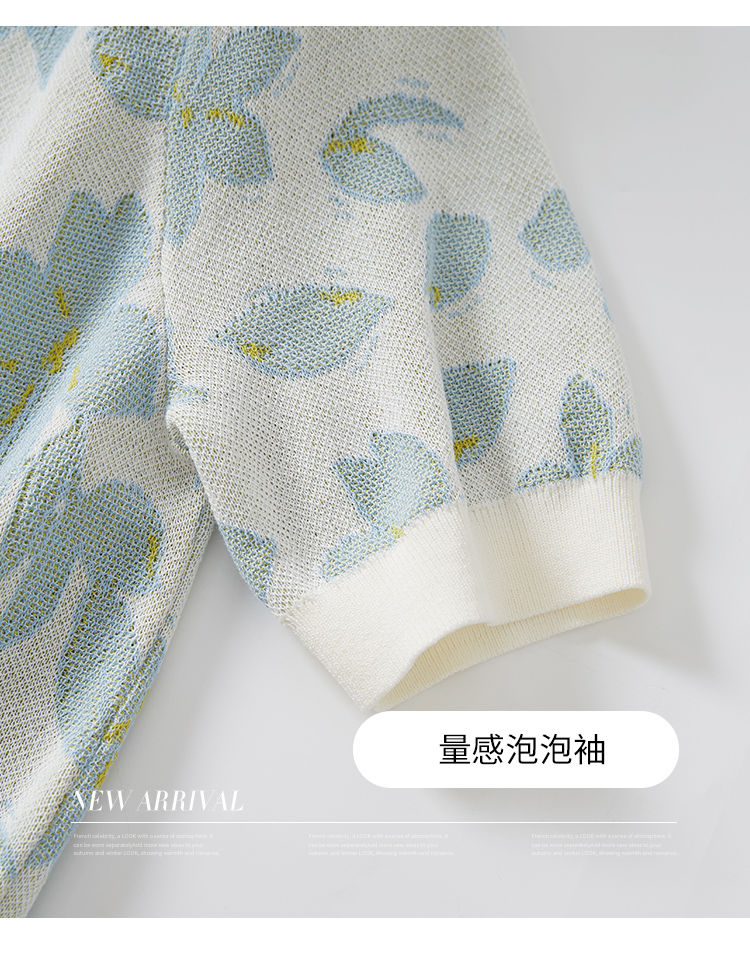 【专属特价】熙世界小香风V领针织衫女薄款夏2025新款法式提花泡泡袖冰丝上衣
