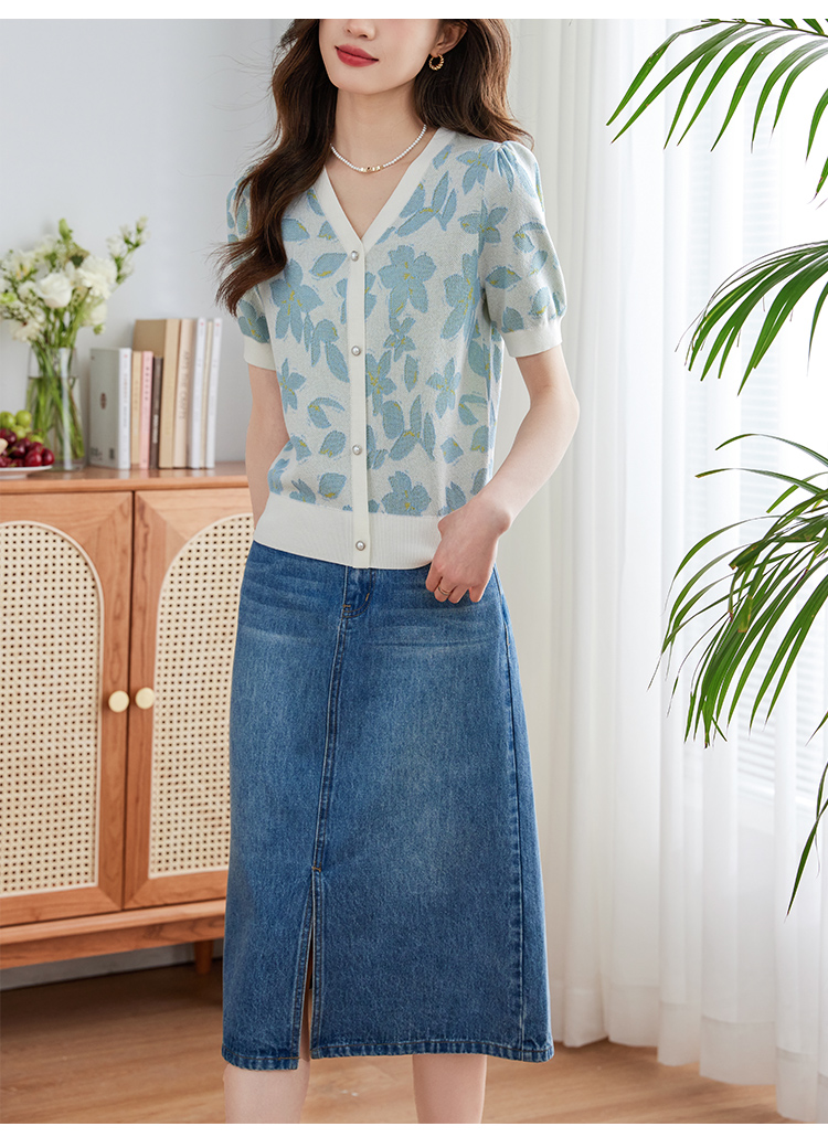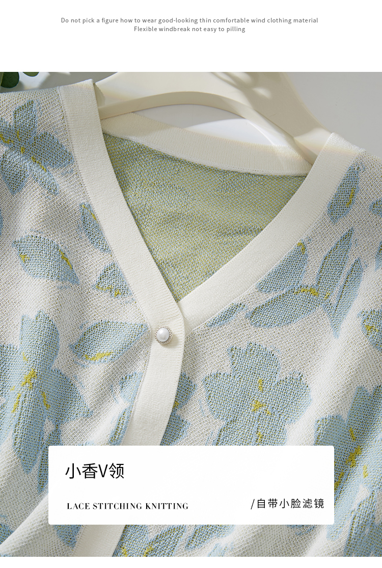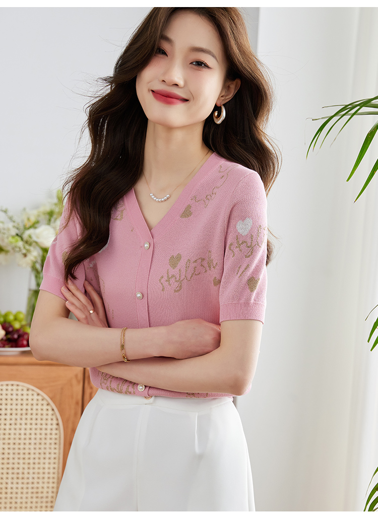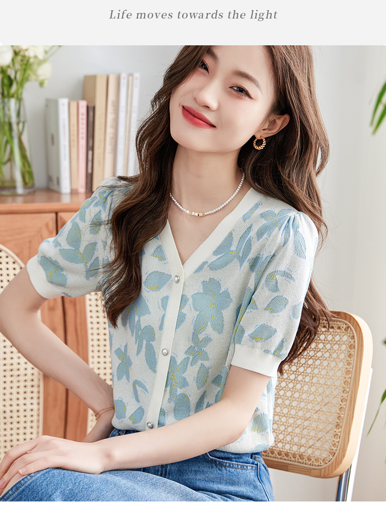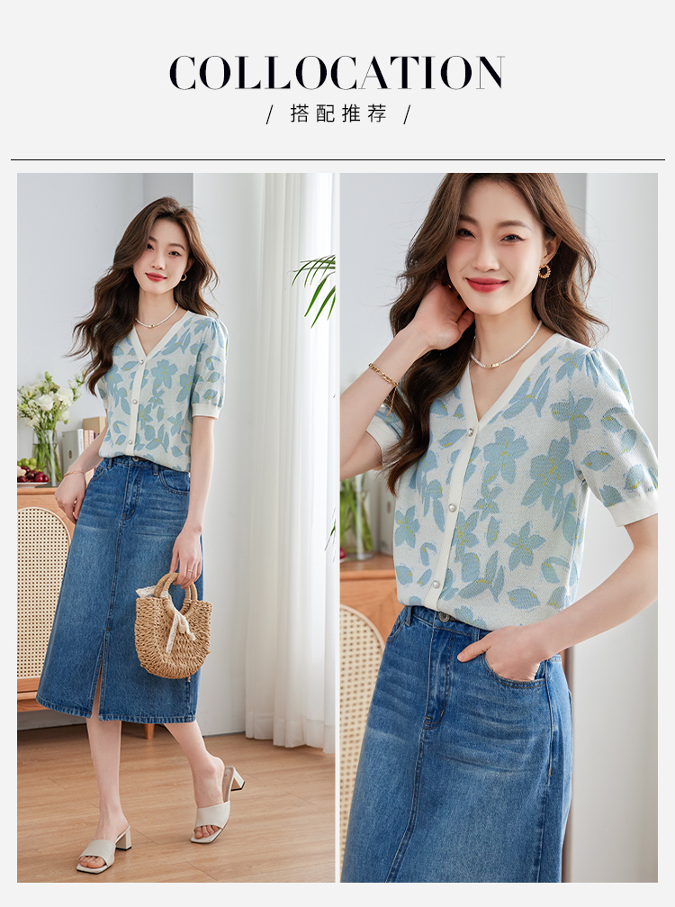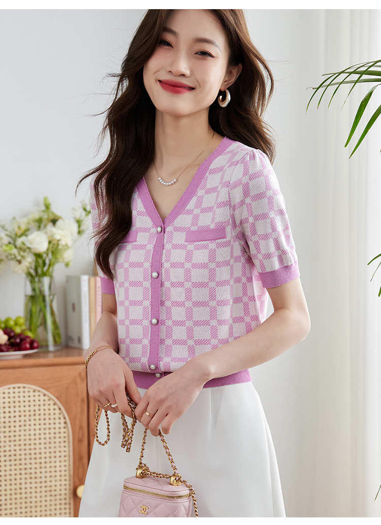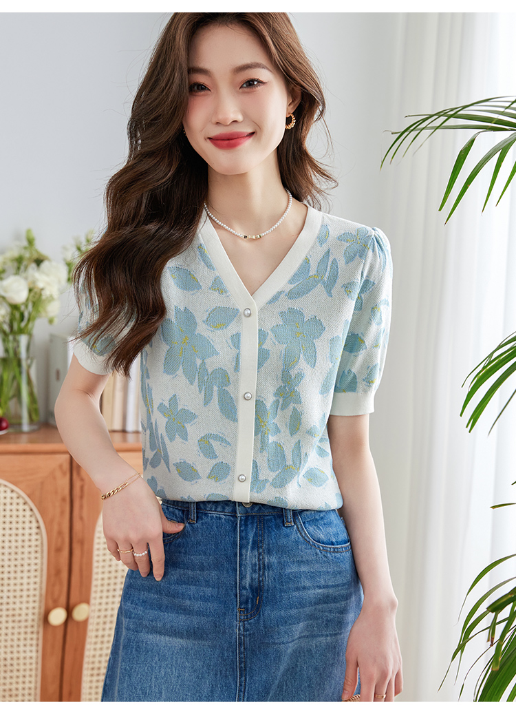 【专属特价】熙世界小香风V领针织衫女薄款夏2025新款法式提花泡泡袖冰丝上衣