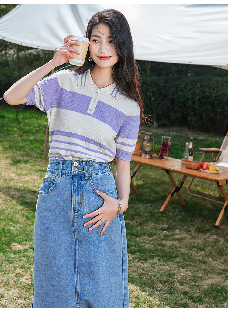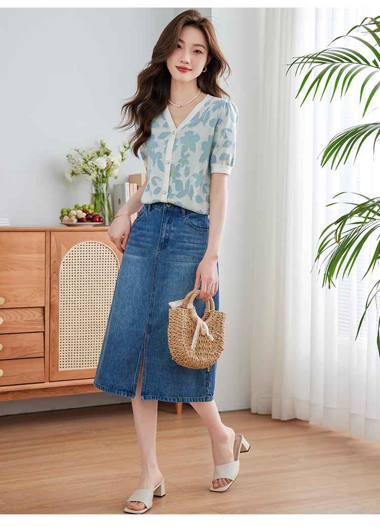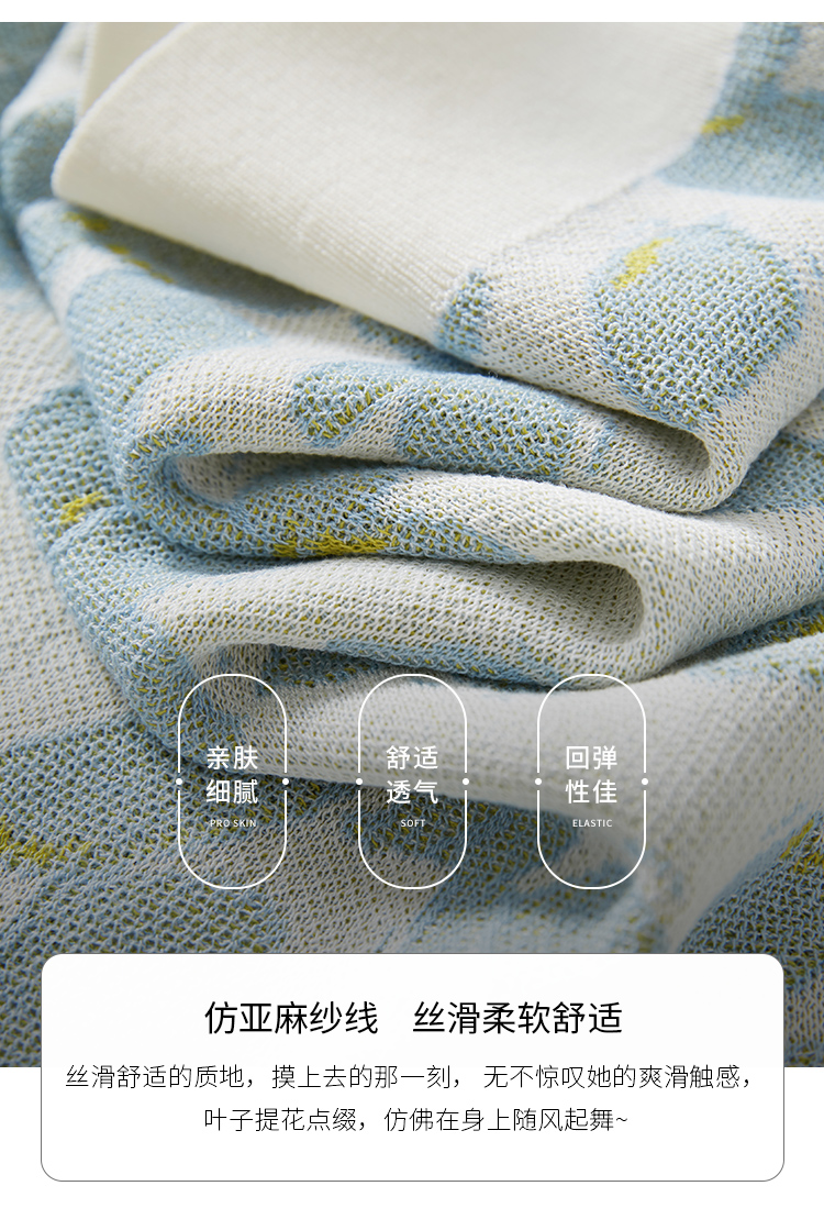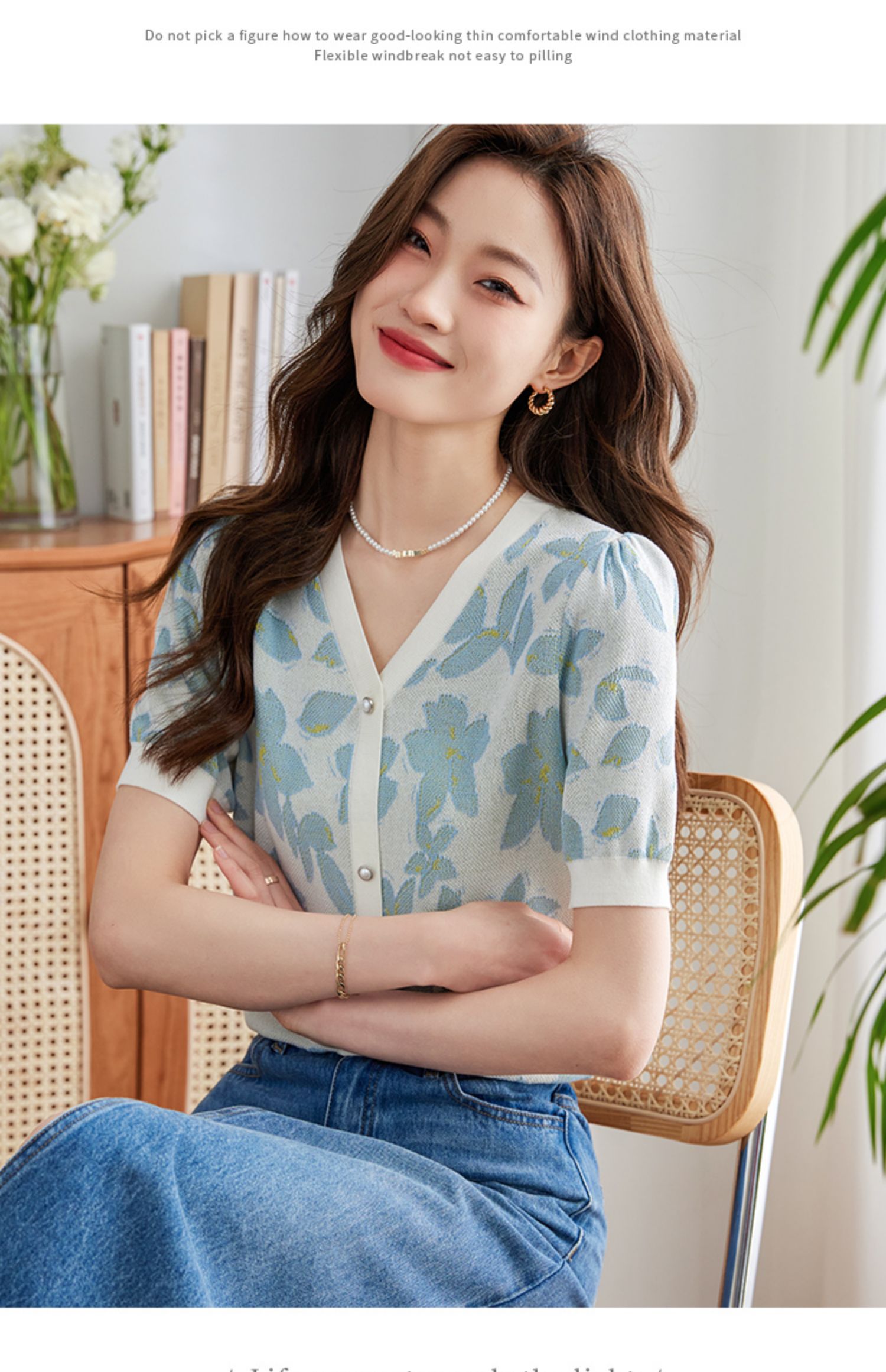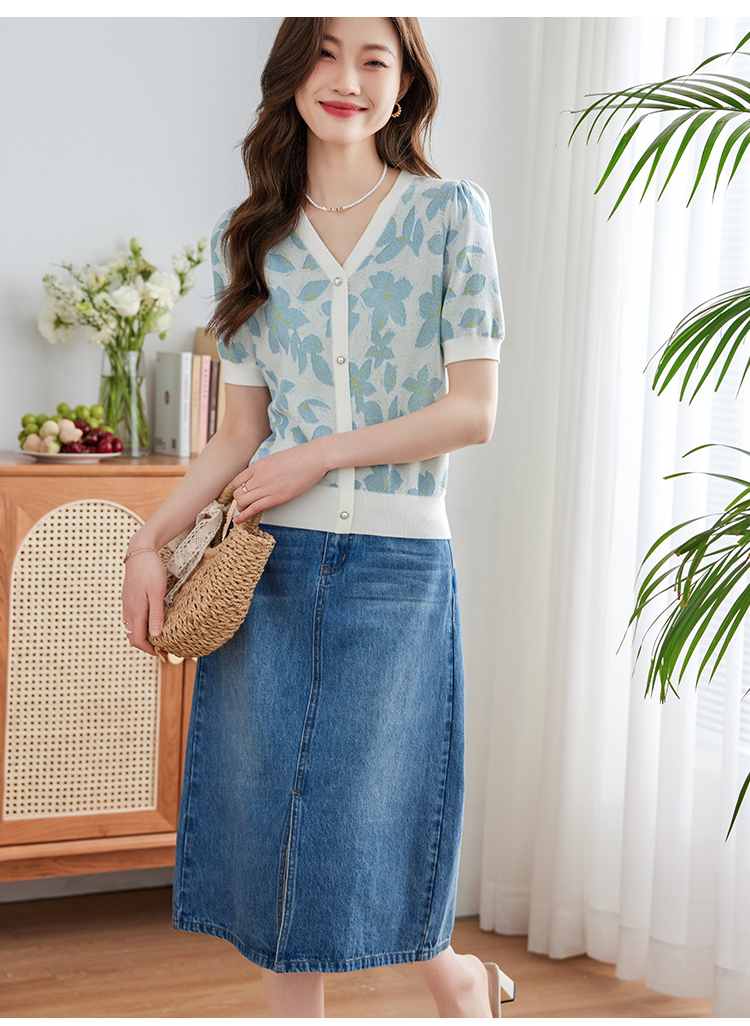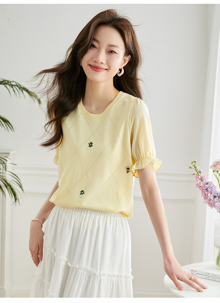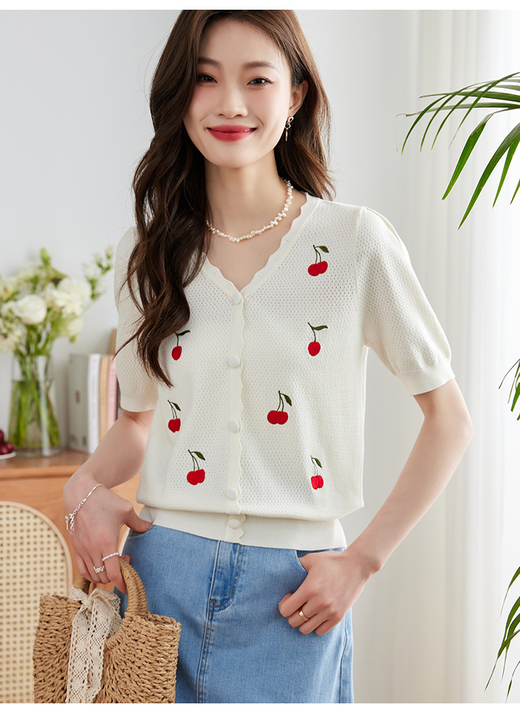 【专属特价】熙世界小香风V领针织衫女薄款夏2025新款法式提花泡泡袖冰丝上衣