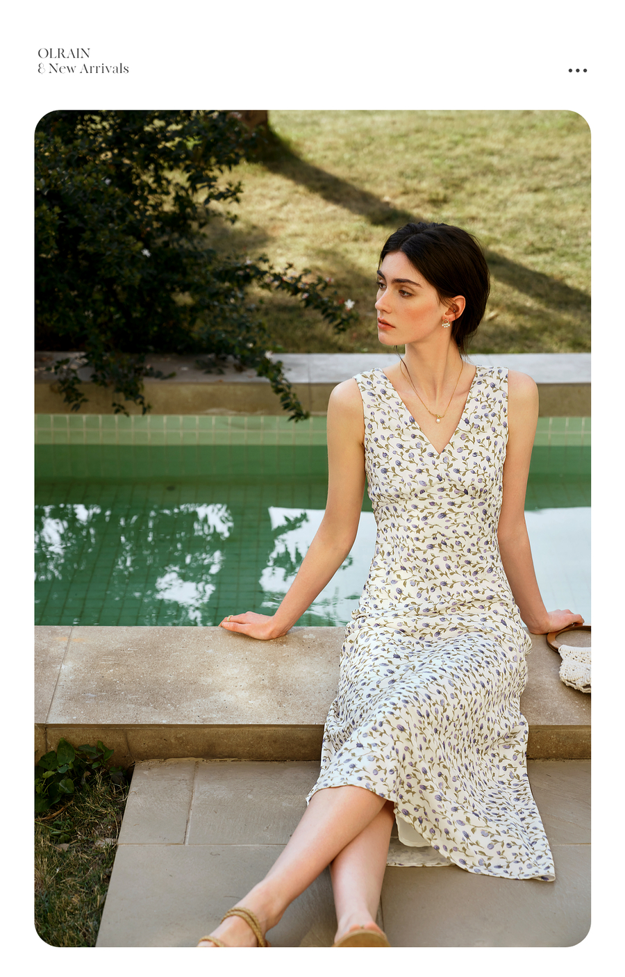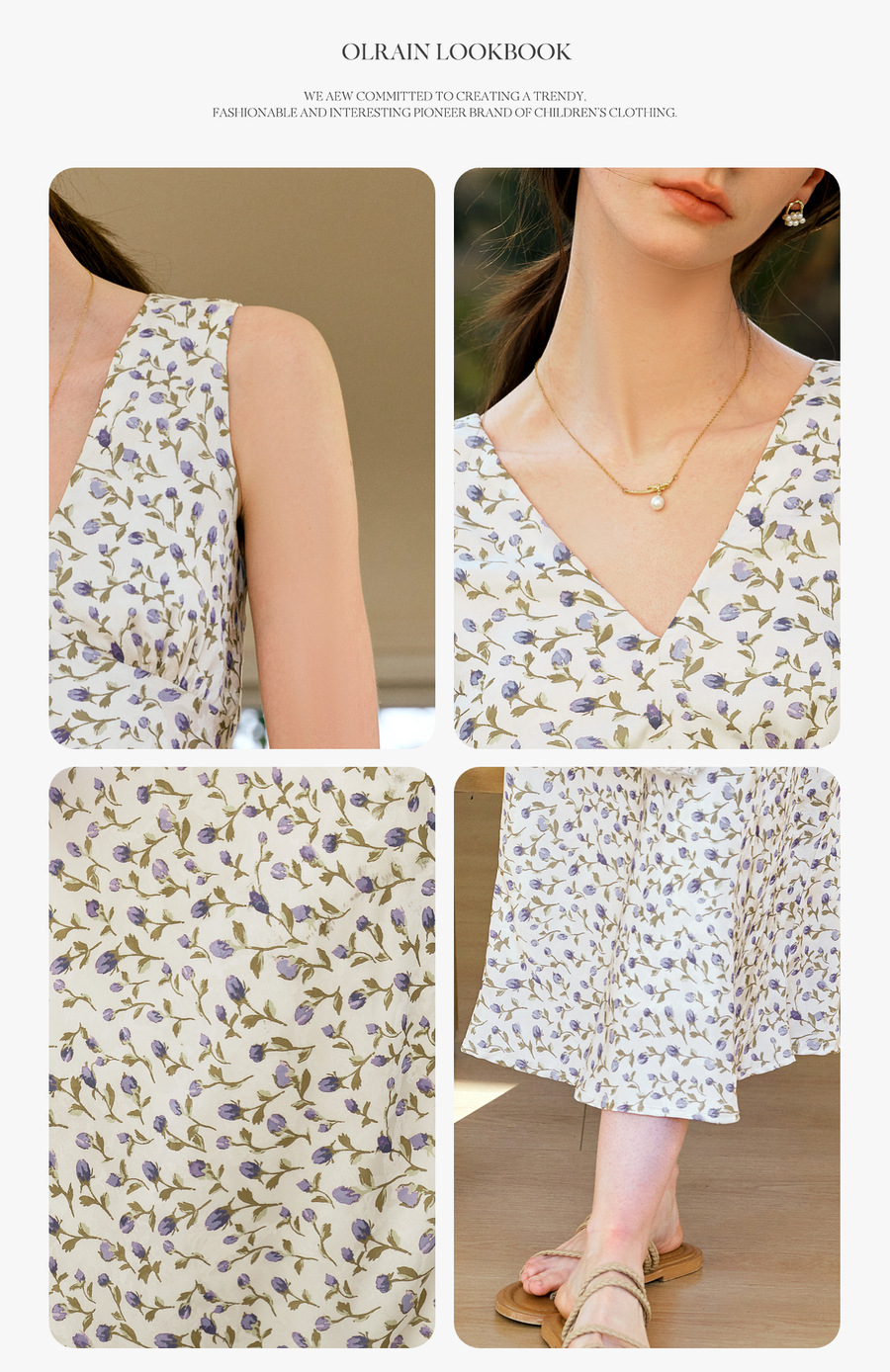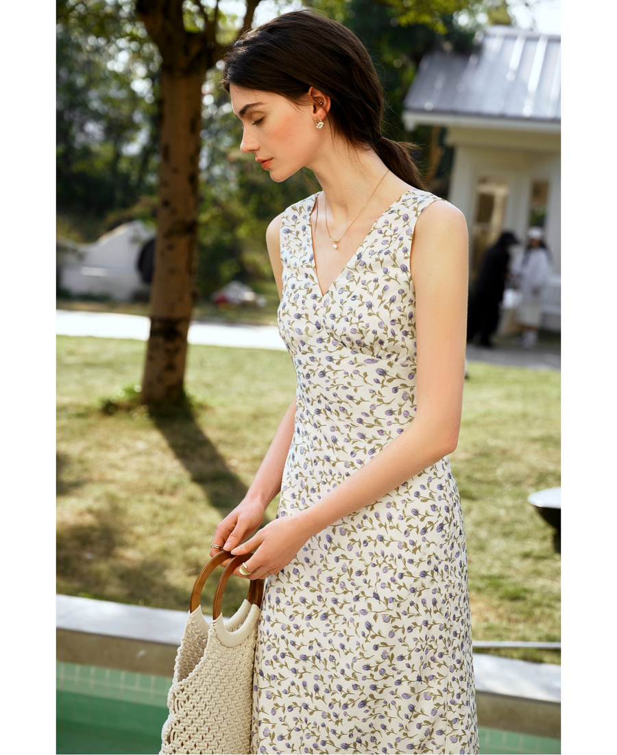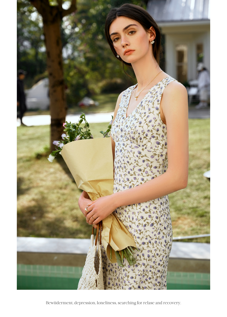 OLrain欧芮儿法式花色连衣裙女夏季2025新款时尚碎花V领无袖长裙