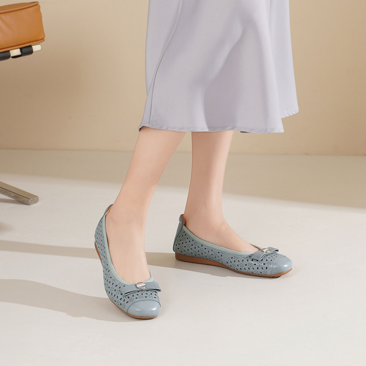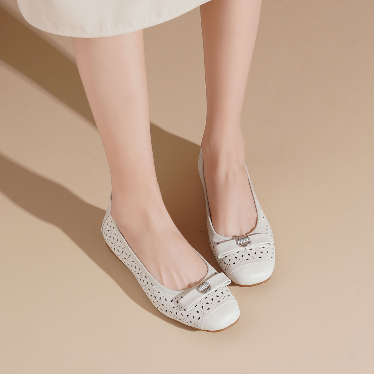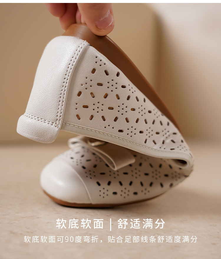 西村名物2025年轻便透气舒适平底蝴蝶结饰扣软底镂空单鞋T25AH15001