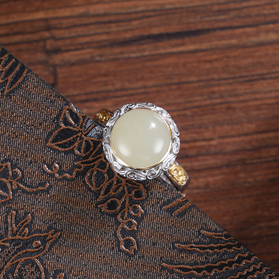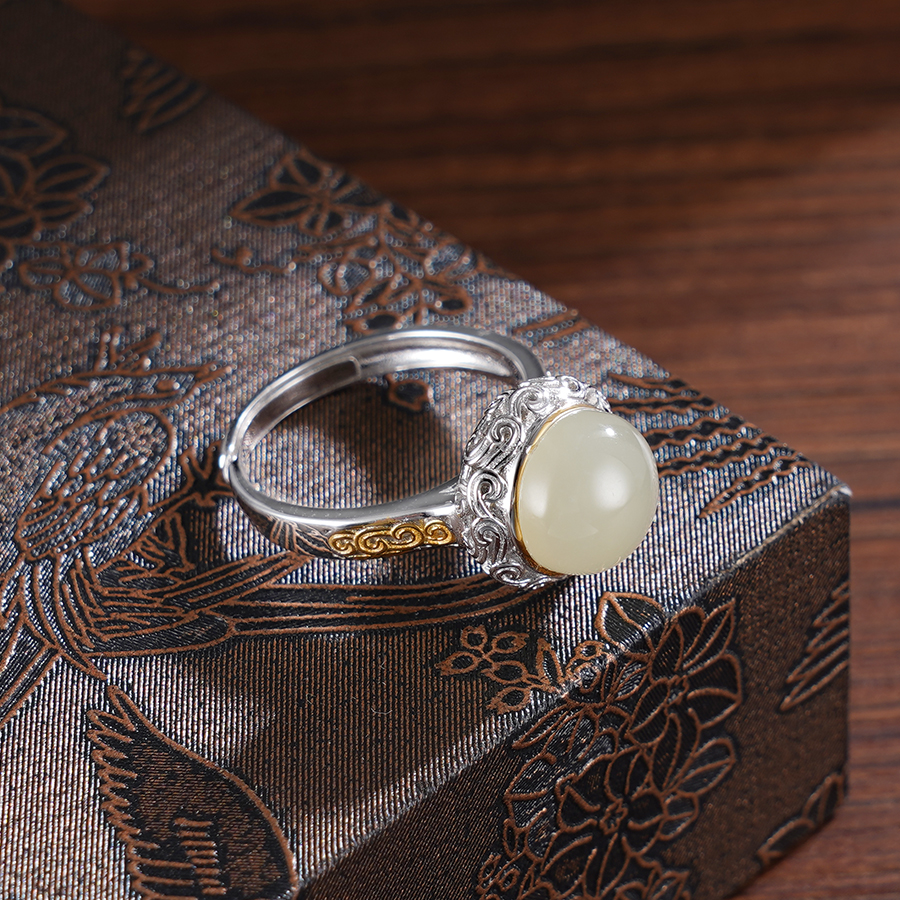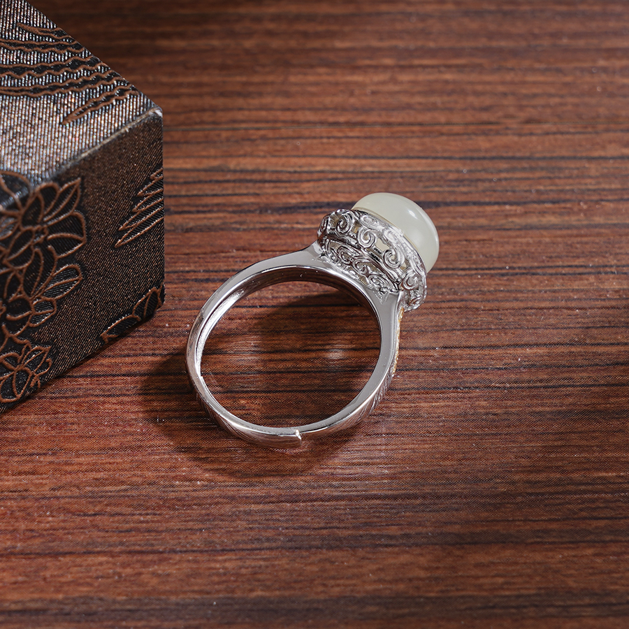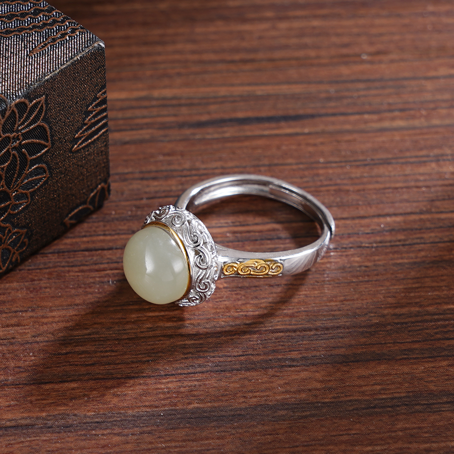 【寓意】:纯银戒指,尽显华贵气质。和田玉镶嵌其间,灵气四溢。佩戴于指,温暖吉祥之感顿生,仿佛被祥瑞环绕。