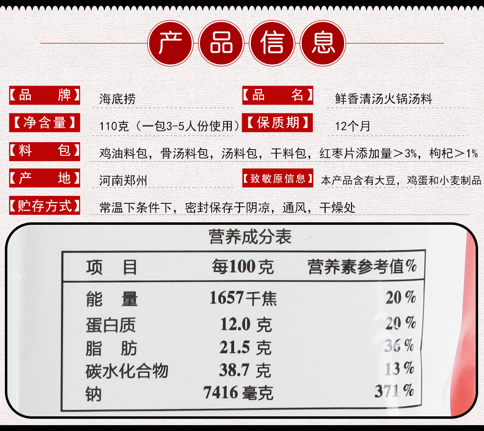 【百】海底捞鲜香清汤火锅汤料110g