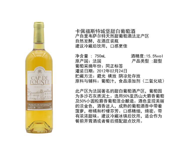 【双支特惠装】卡佩福斯特城堡甜白葡萄酒 Chateau Cap de Fouste Rivesalte Ambre 750ml*2