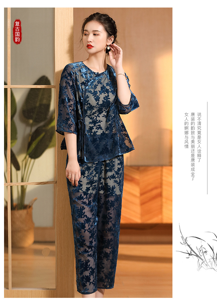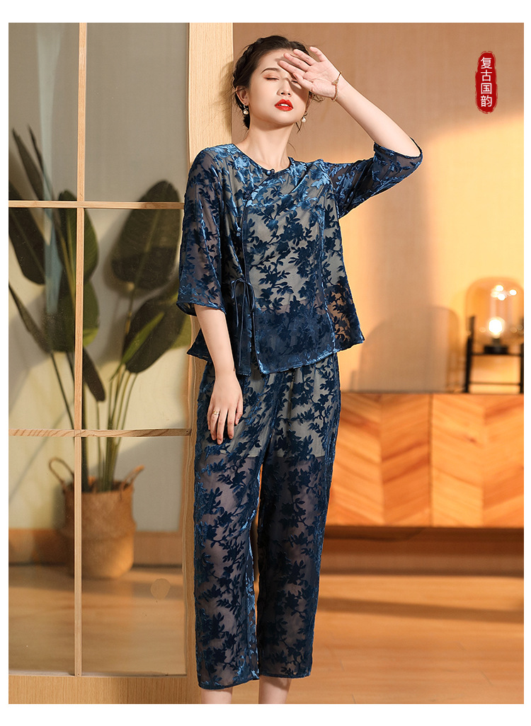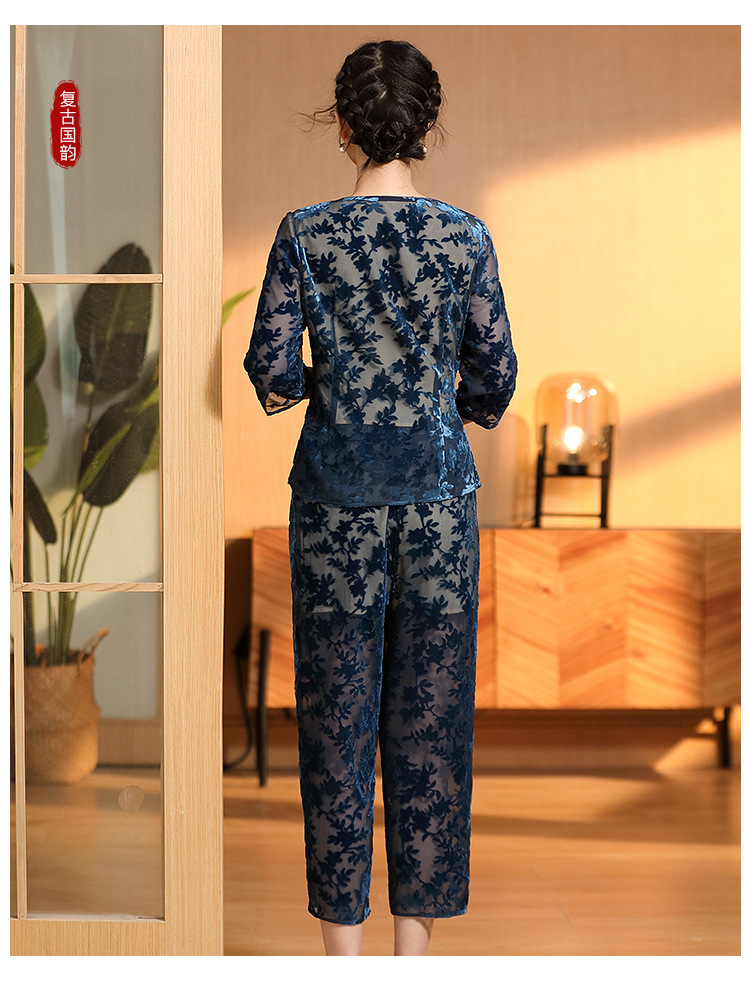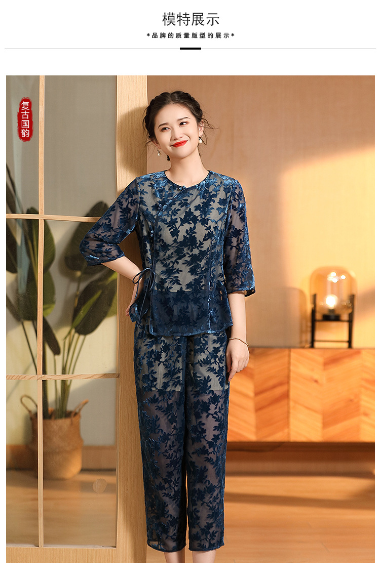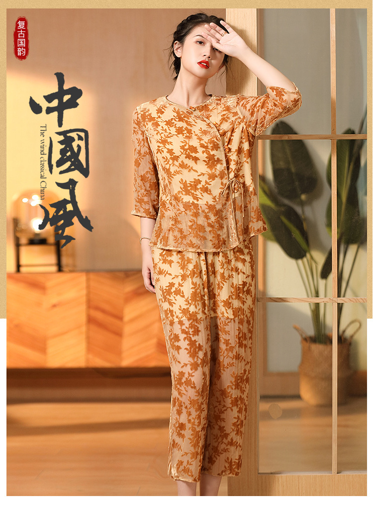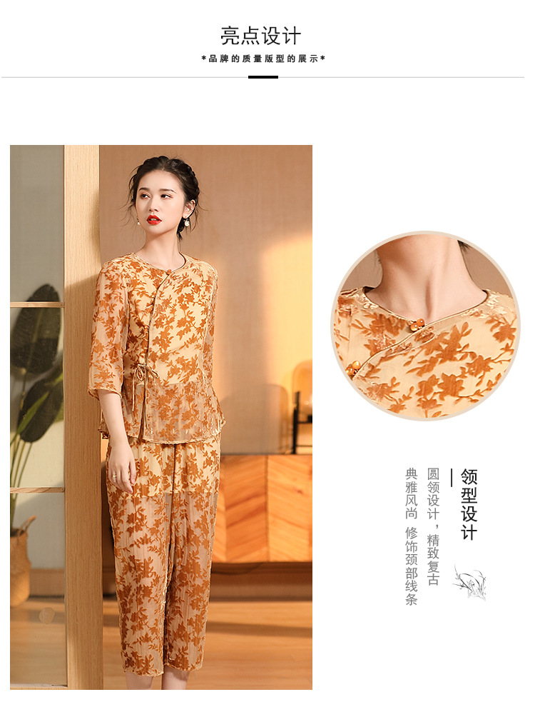 国风复古,圆领宽松上衣+九分裤精品烧花丝绒套装AYK-220512