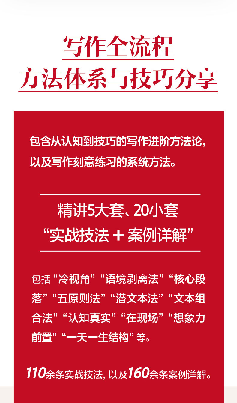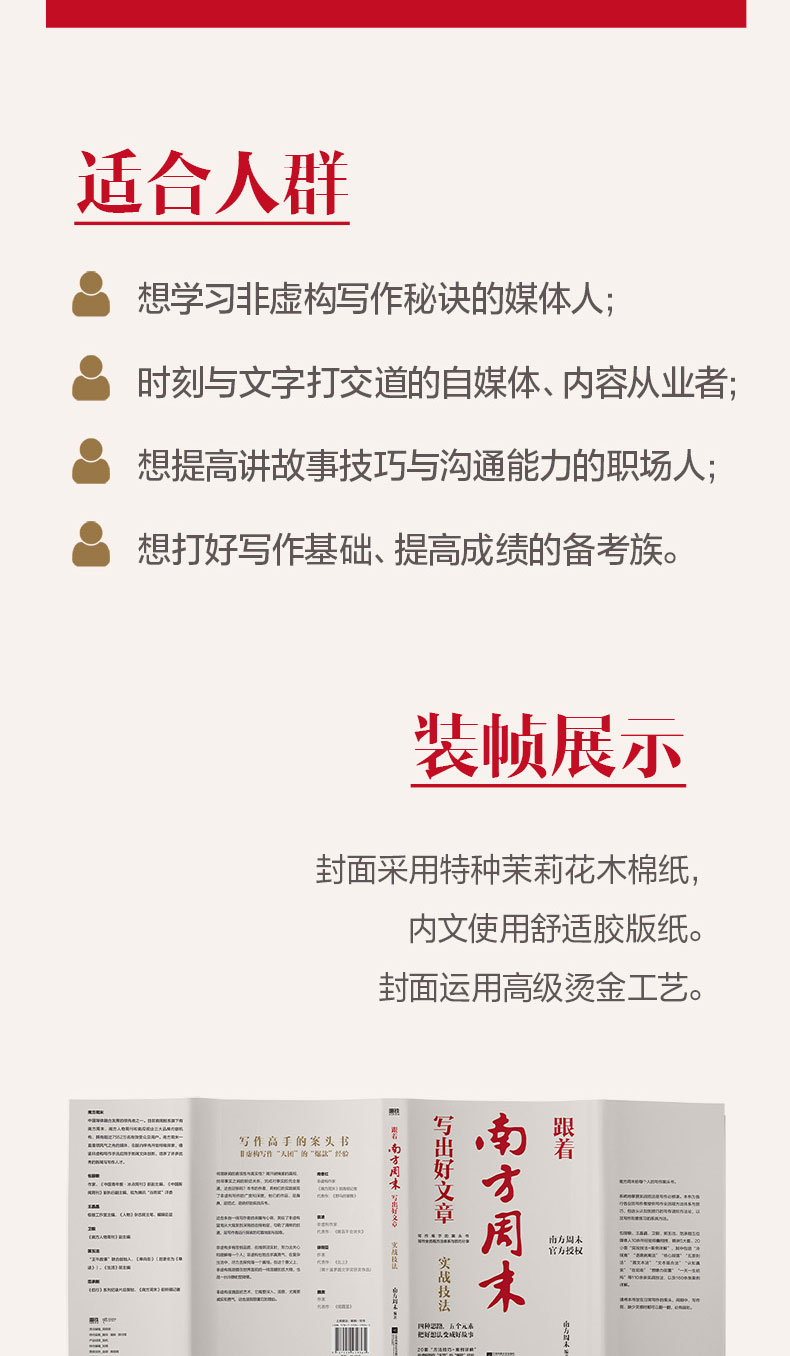 "★南方周末官方授权 ★南方周末给每个人的写作案头书,把好想法变成好故事。 ★非虚构写作天团的爆款经验:《中国新闻周刊》前执行副主编包丽敏、《人物》杂志前主笔王晶晶、《南方人物周刊》副主编卫毅、《单向街》前主编郭玉洁、《侣行》系列纪录片总策划范承刚,五位资深媒体人十余年经验倾囊相授。 ★分享写作全流程方法体系与技巧,包含从认知到技巧的写作进阶方法论,以及写作刻意练习的系统方法。 ★精讲5大套、20小套“实战技法+案例详解”,110余条实战技法,以及160余条案例详解。 ★《南方都市报》首席研究员南香红、“真实故事计划”总主笔袁凌、《人民文学》副主编徐则臣、《烟霞里》作者魏微等作家一致推荐。 ★适合人群:想学习非虚构写作秘诀的媒体人;时刻与文字打交道的自媒体、内容从业者;想提高讲故事技巧与沟通能力的职场人;想打好写作基础、提高成绩的备考族。 "