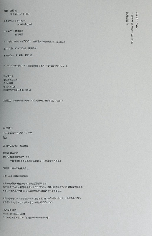 さらに、新たな感覚を求める赤楚が「伝統」「言語」「宇宙」の視点から出逢った玄人たちとの対話も収録され、ひとりの人間赤楚衛二の“ありのまま”を存分に感じることが出来る珠玉の1冊に仕上がっている。