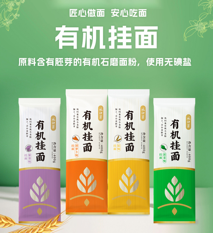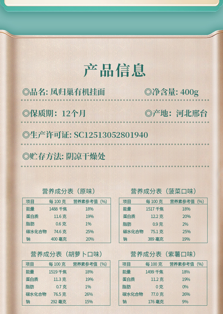 凤归巢 有机挂面400g 胡萝卜味菠菜味紫薯味原味 劲道面条 原料凤归巢有机石磨面粉