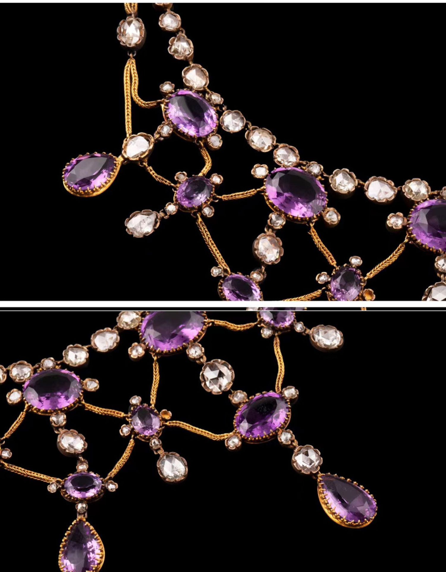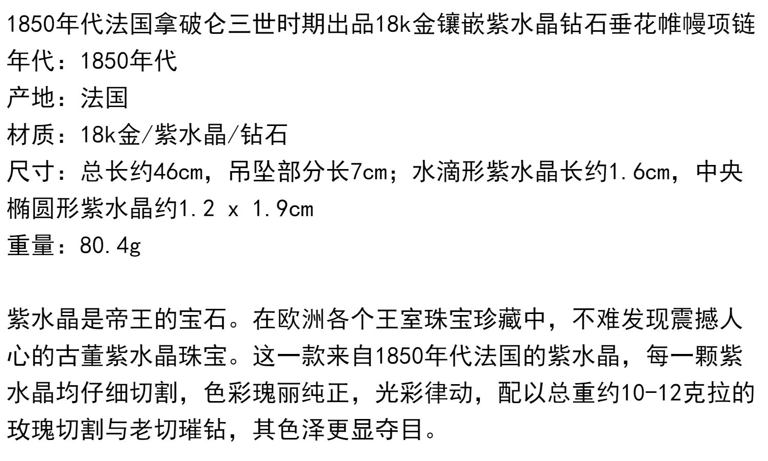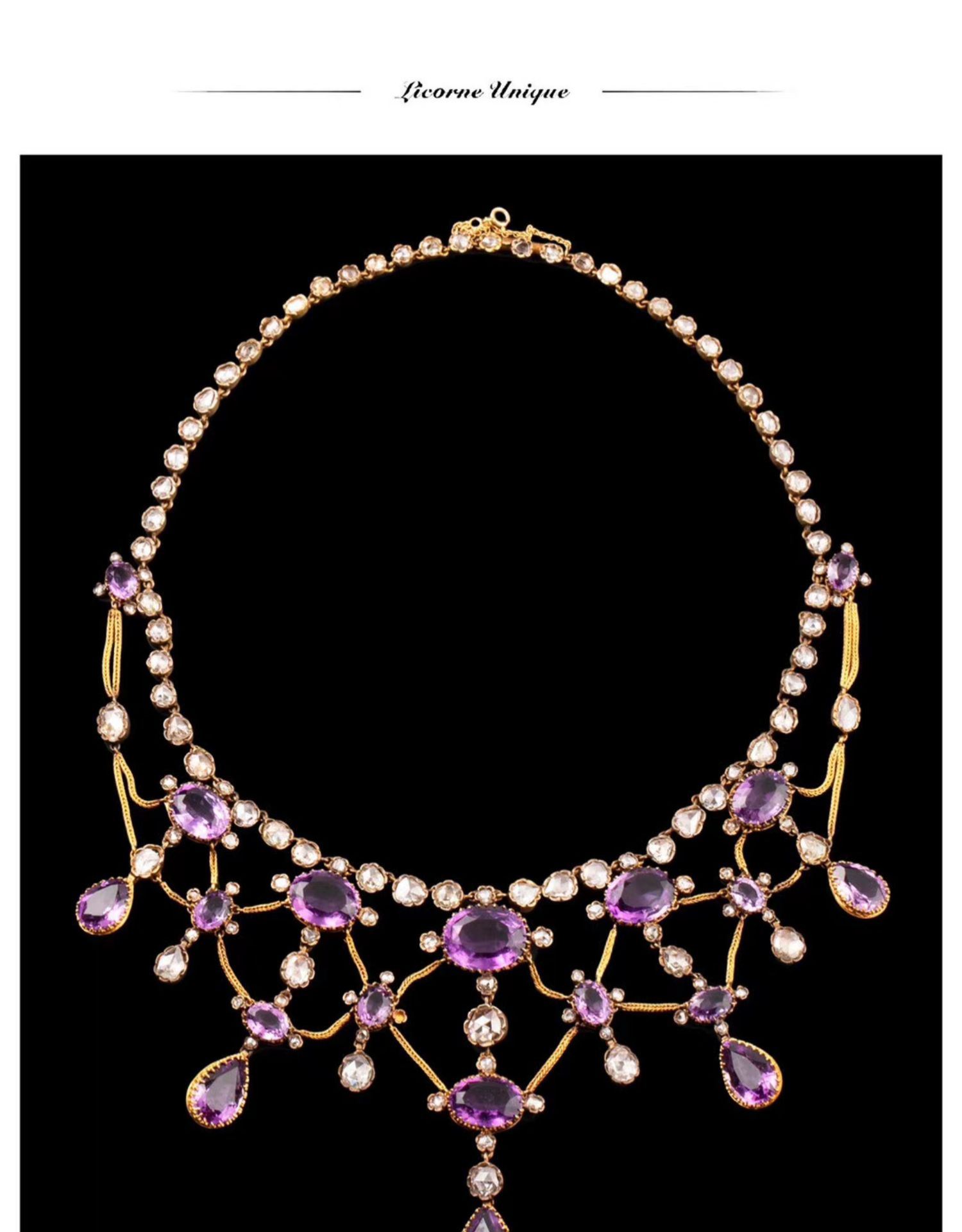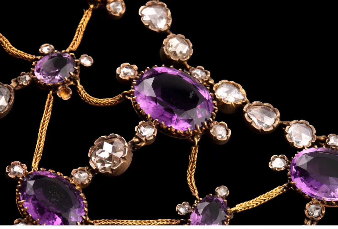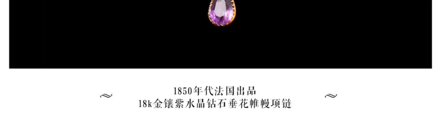 独角鹿西洋古董首饰法国出品18k金镶嵌紫水晶钻石垂花帷幔项链