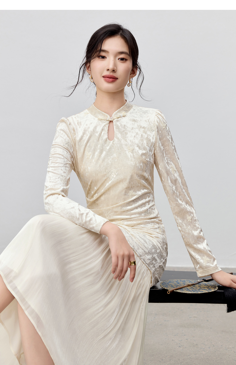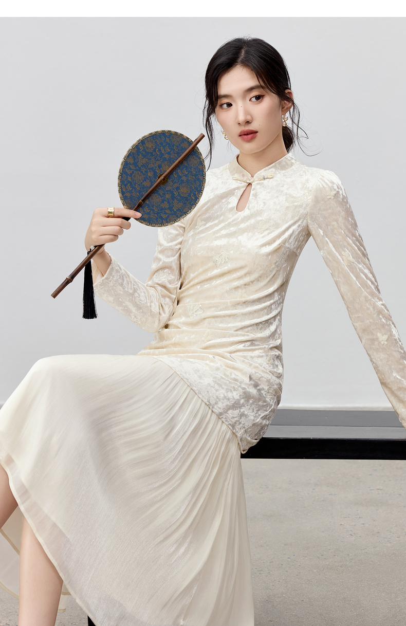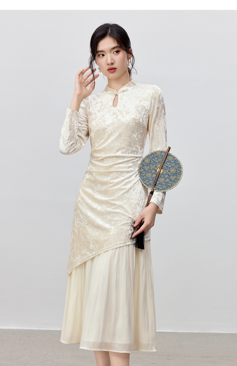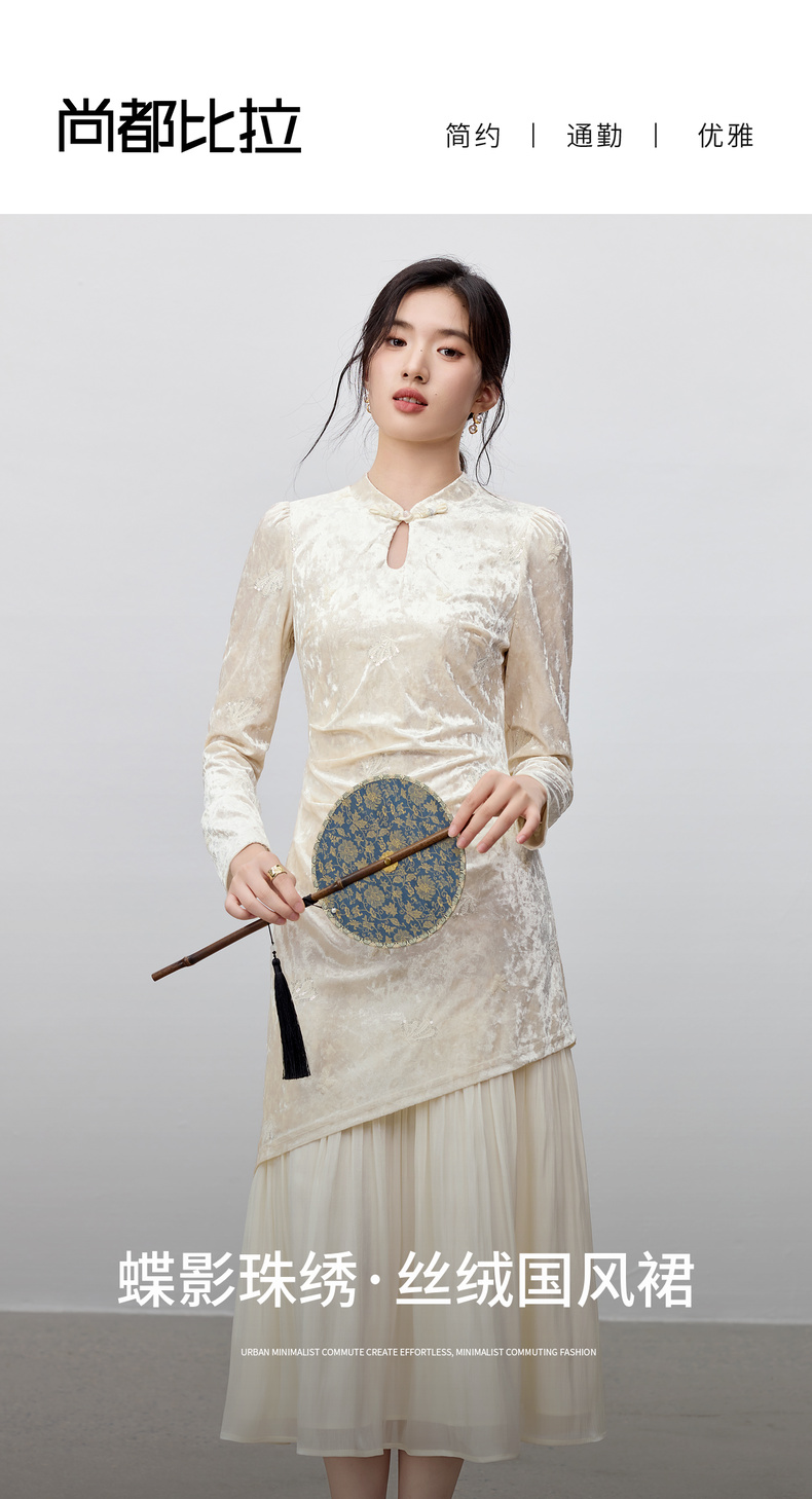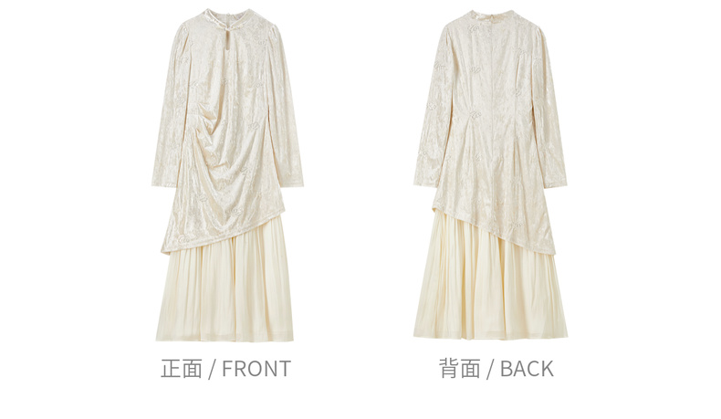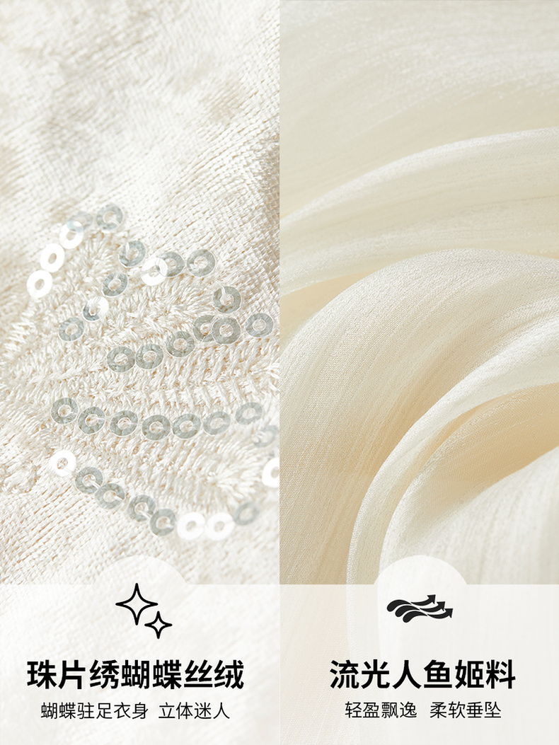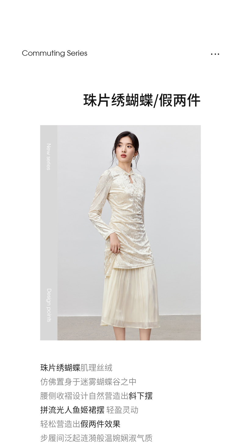【内购】【假两件】国风立领盘扣收褶斜下摆拼人鱼姬丝绒珠片绣蝴蝶连衣裙-Q53LI3896