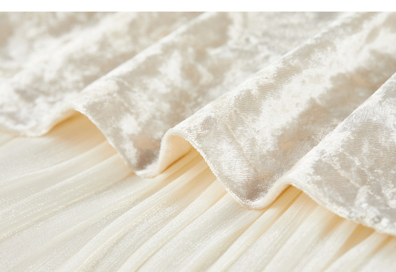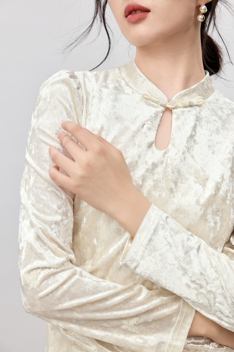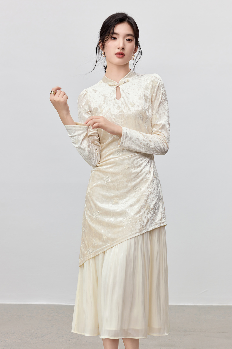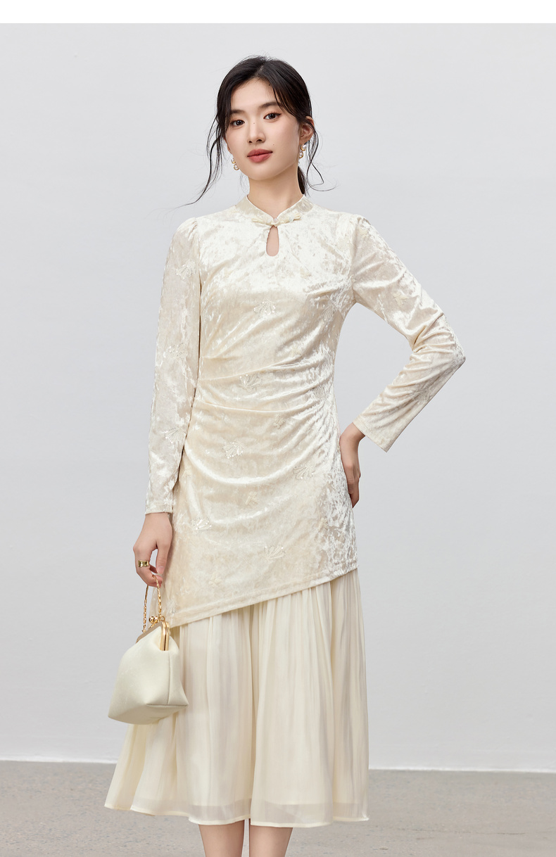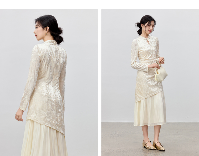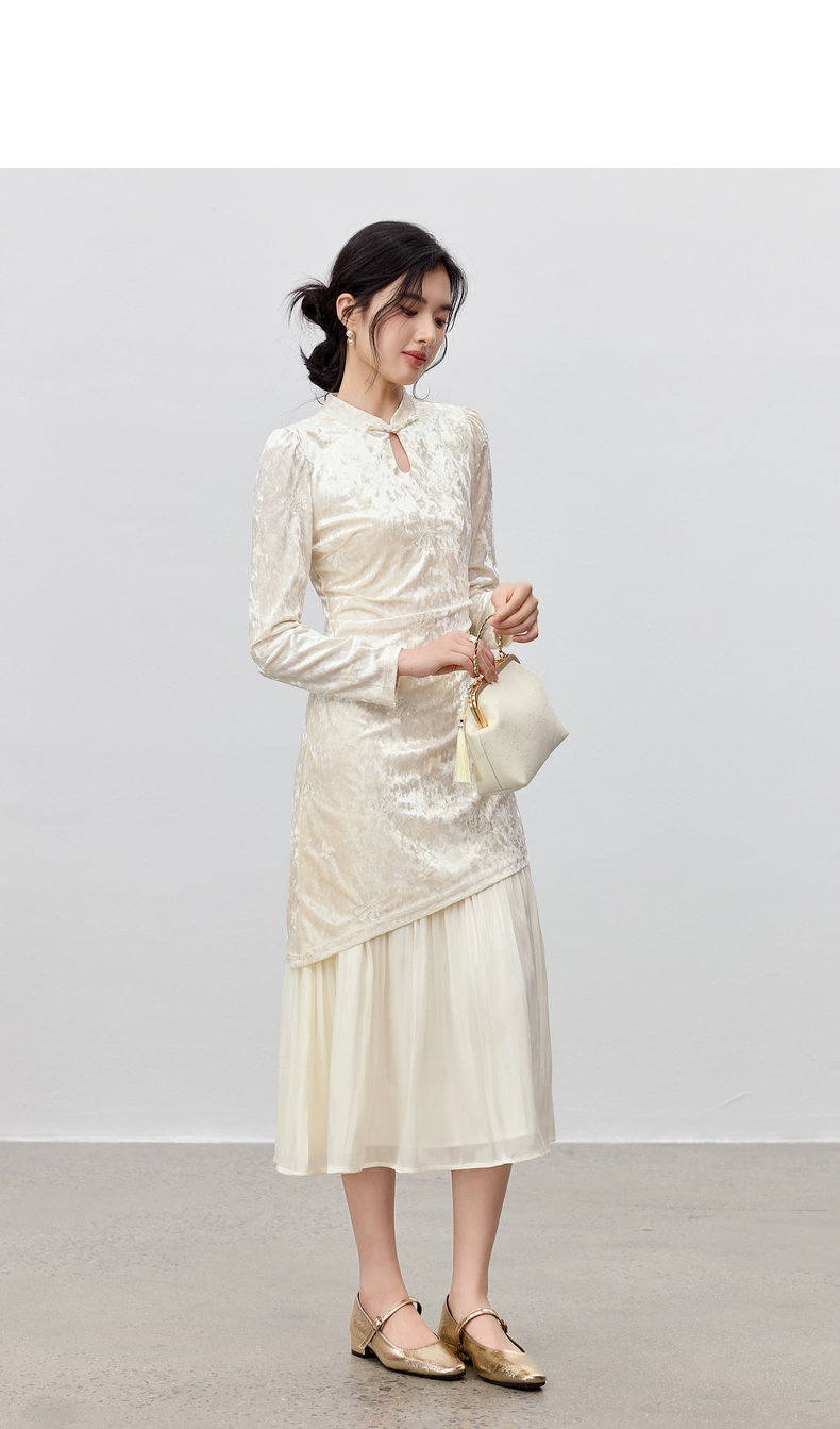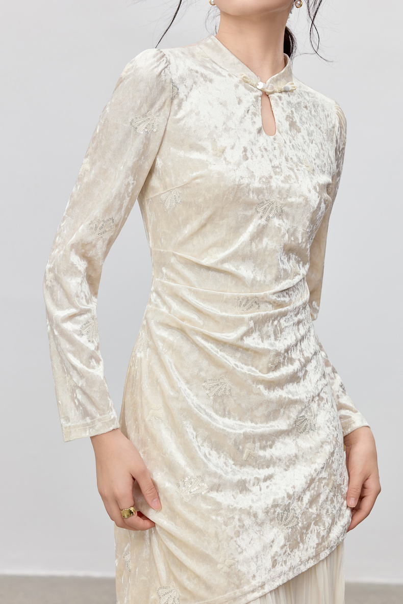 【内购】【假两件】国风立领盘扣收褶斜下摆拼人鱼姬丝绒珠片绣蝴蝶连衣裙-Q53LI3896