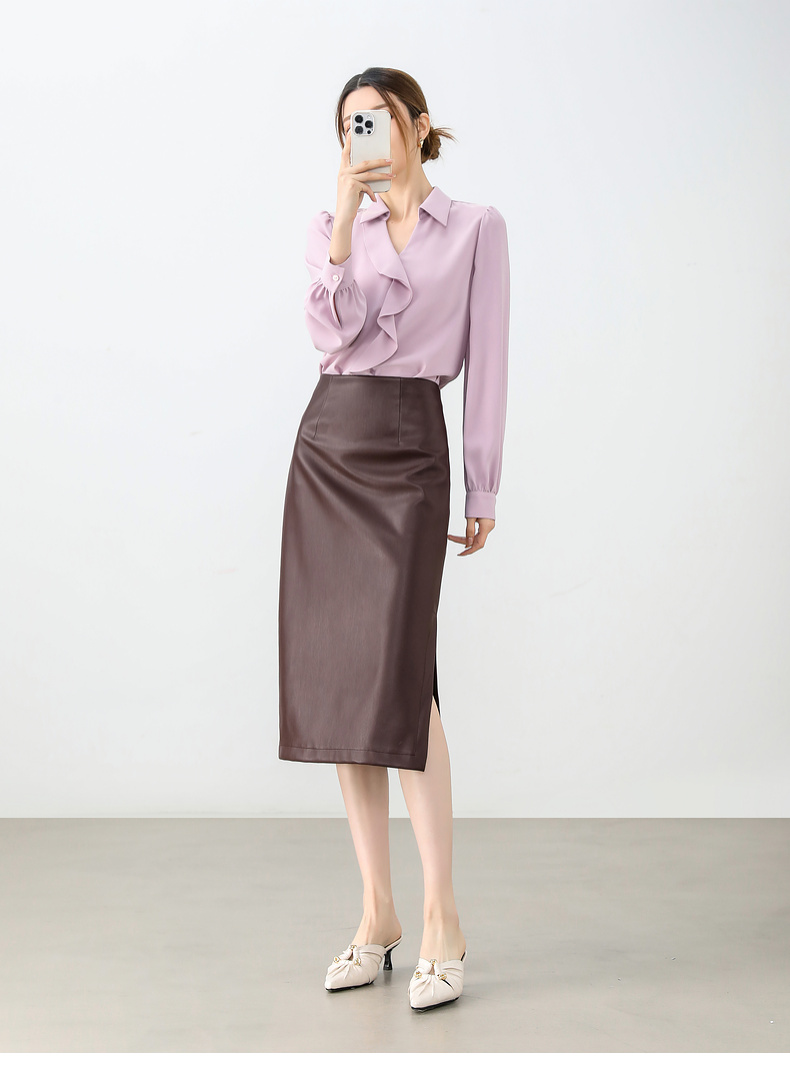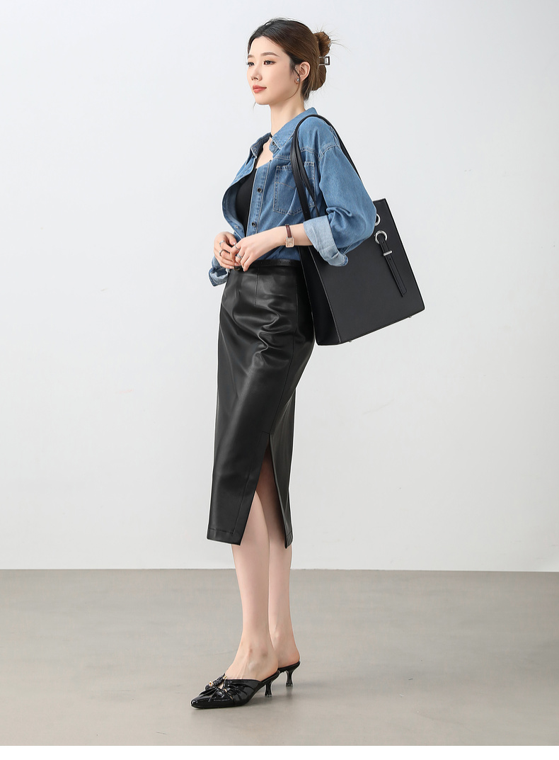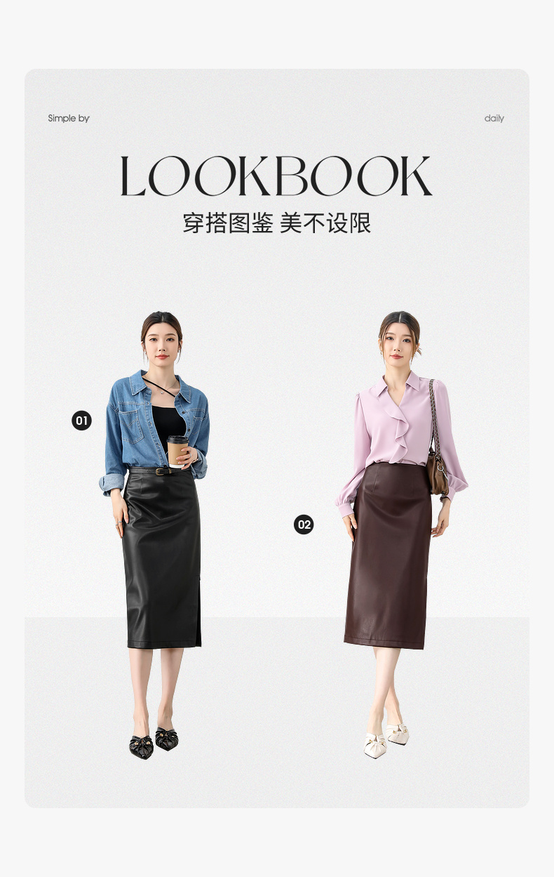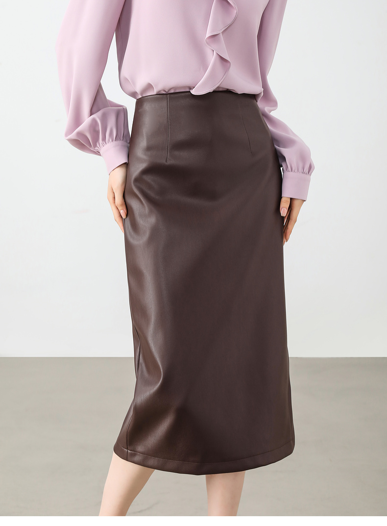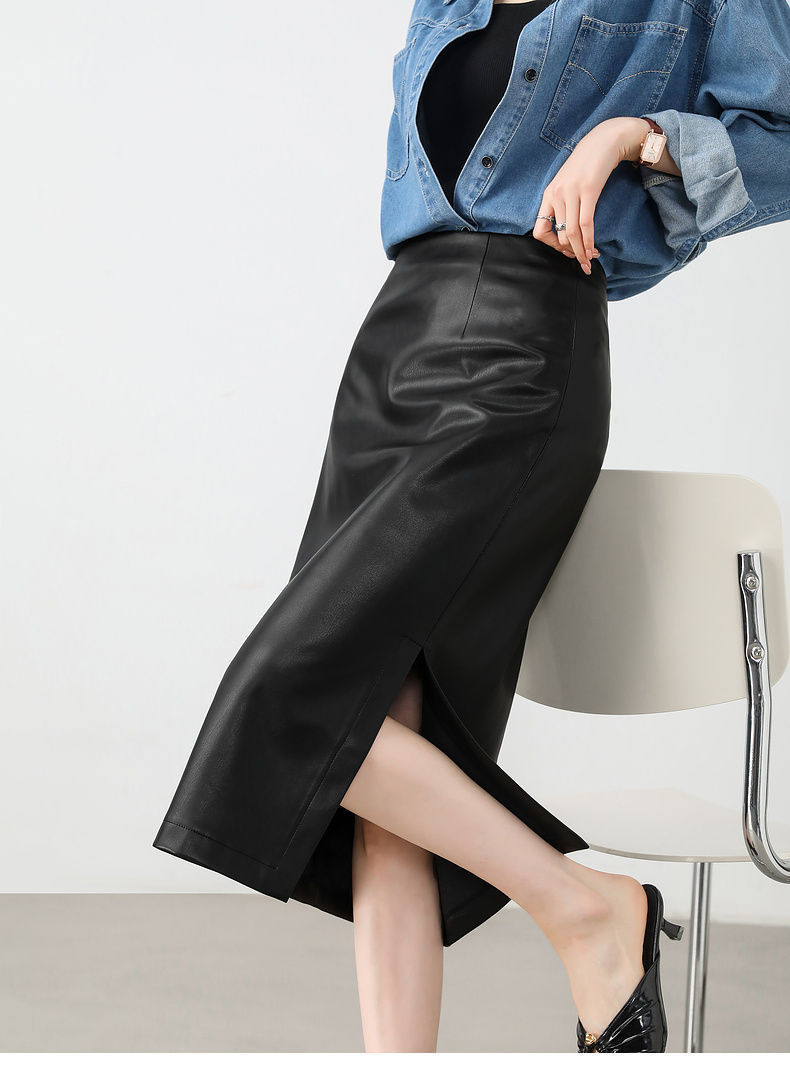 【尚都比拉】时髦柔软PU皮通勤百搭包臀开衩裙中长裙美拉德复古高腰加绒半裙-151Q58382