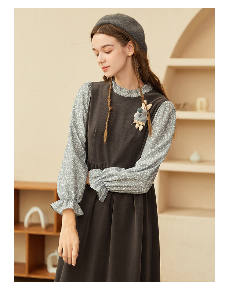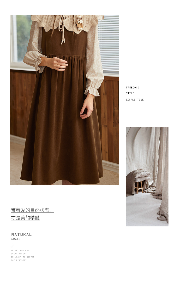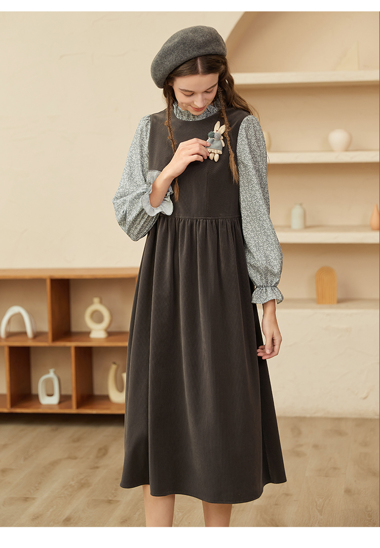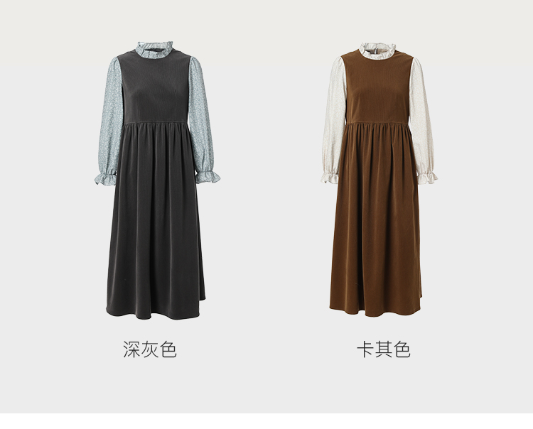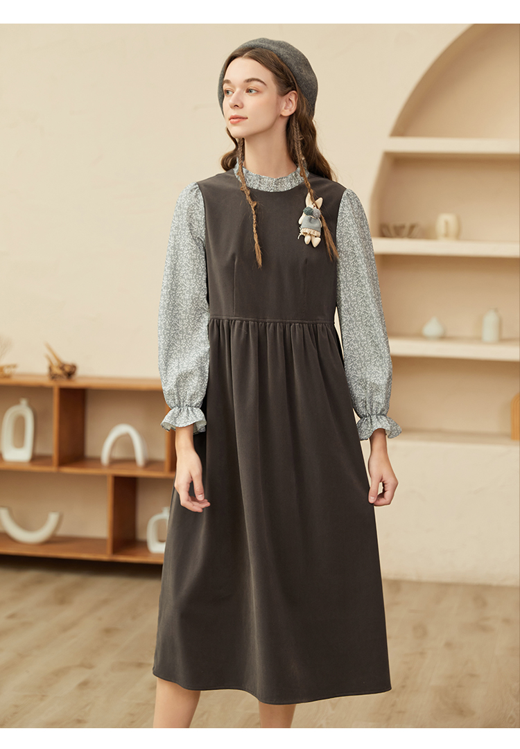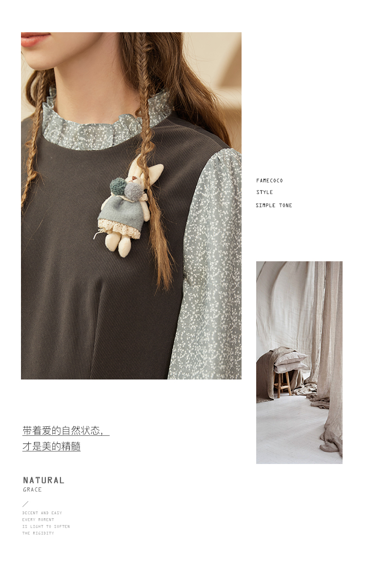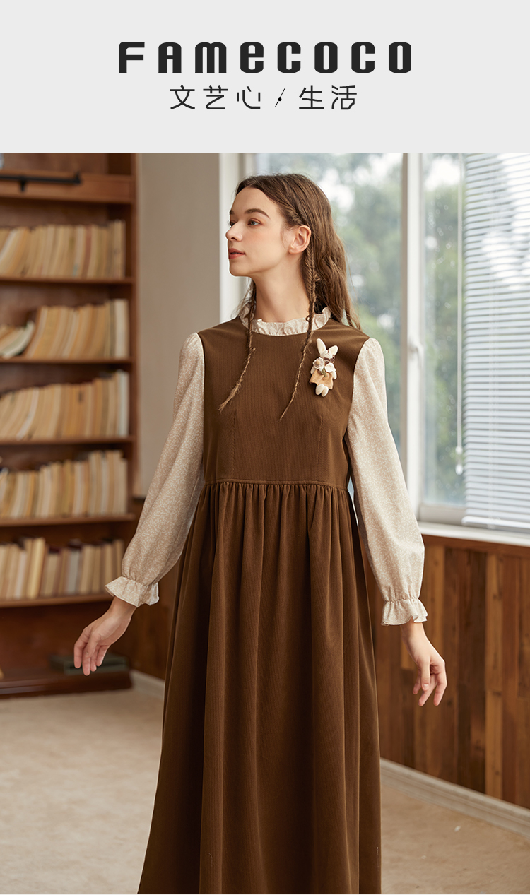 Famecoco范可儿雪纺拼接假两件连衣裙秋冬宽松遮肚子长裙F228FA018