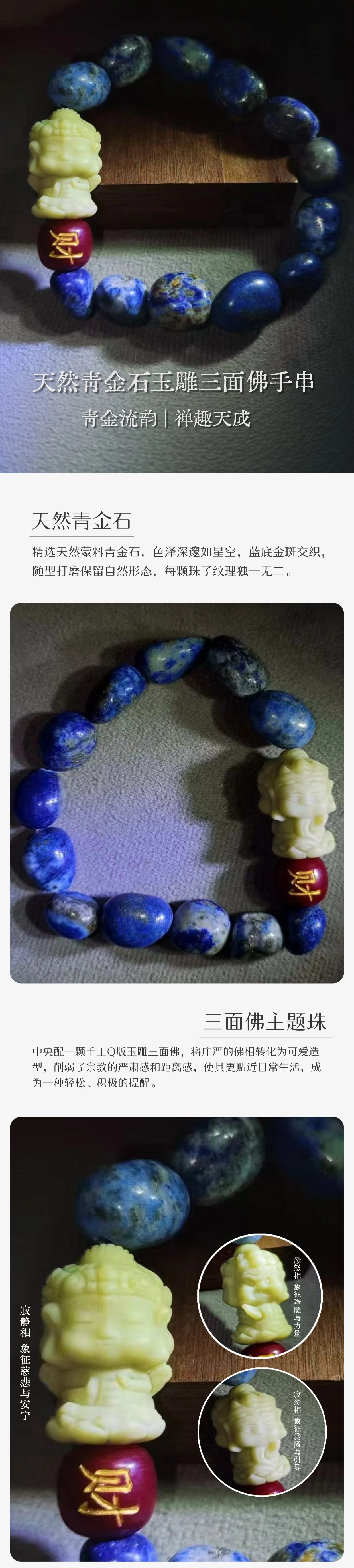 天然青金石随型蒙料 玉雕三面佛 旺财珠手串 文创礼品